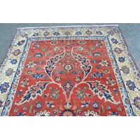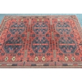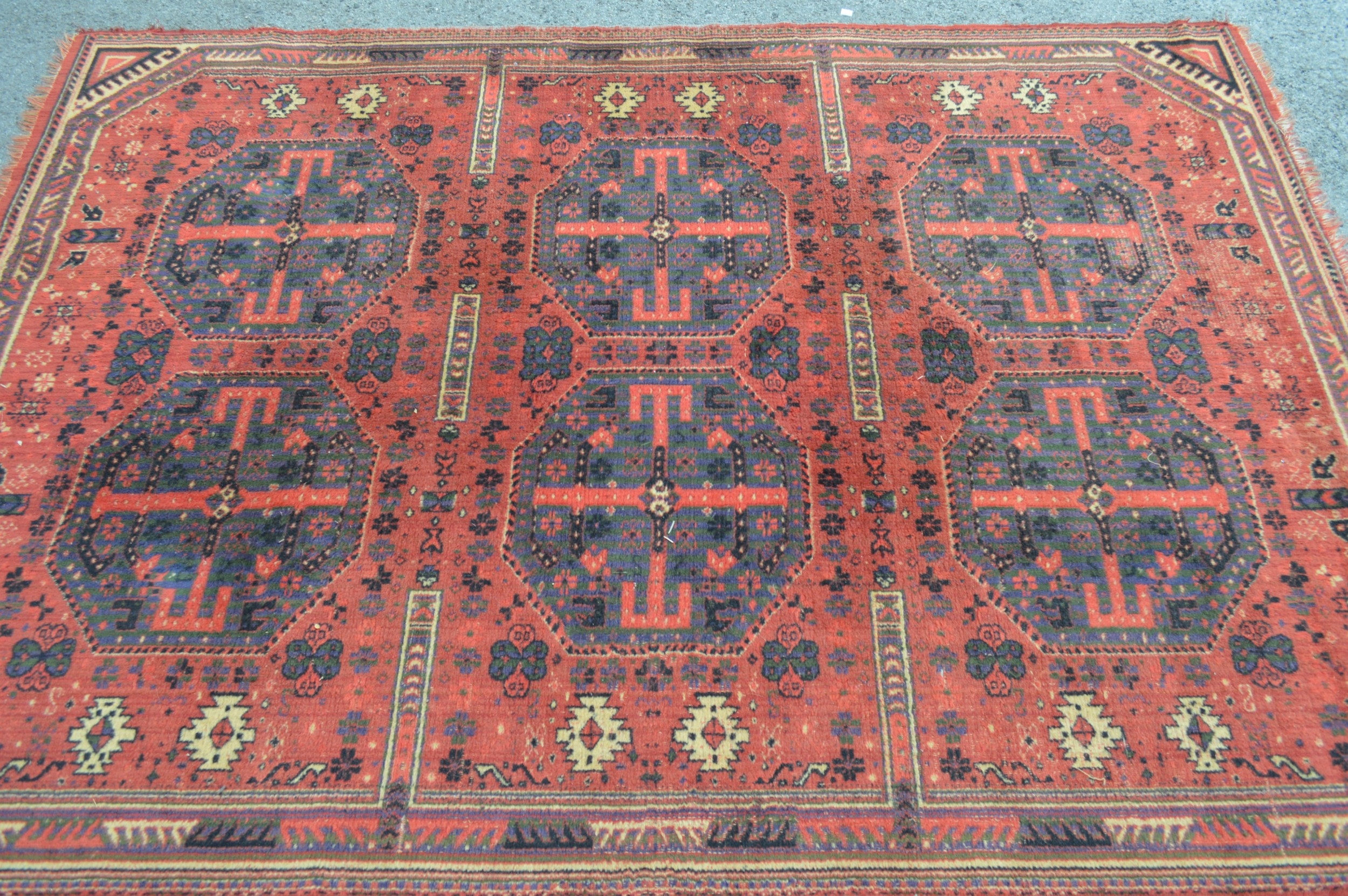 Machine woven Afghan style rug with six gols on a red ground with borders, 222 x 158cm