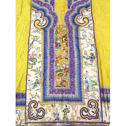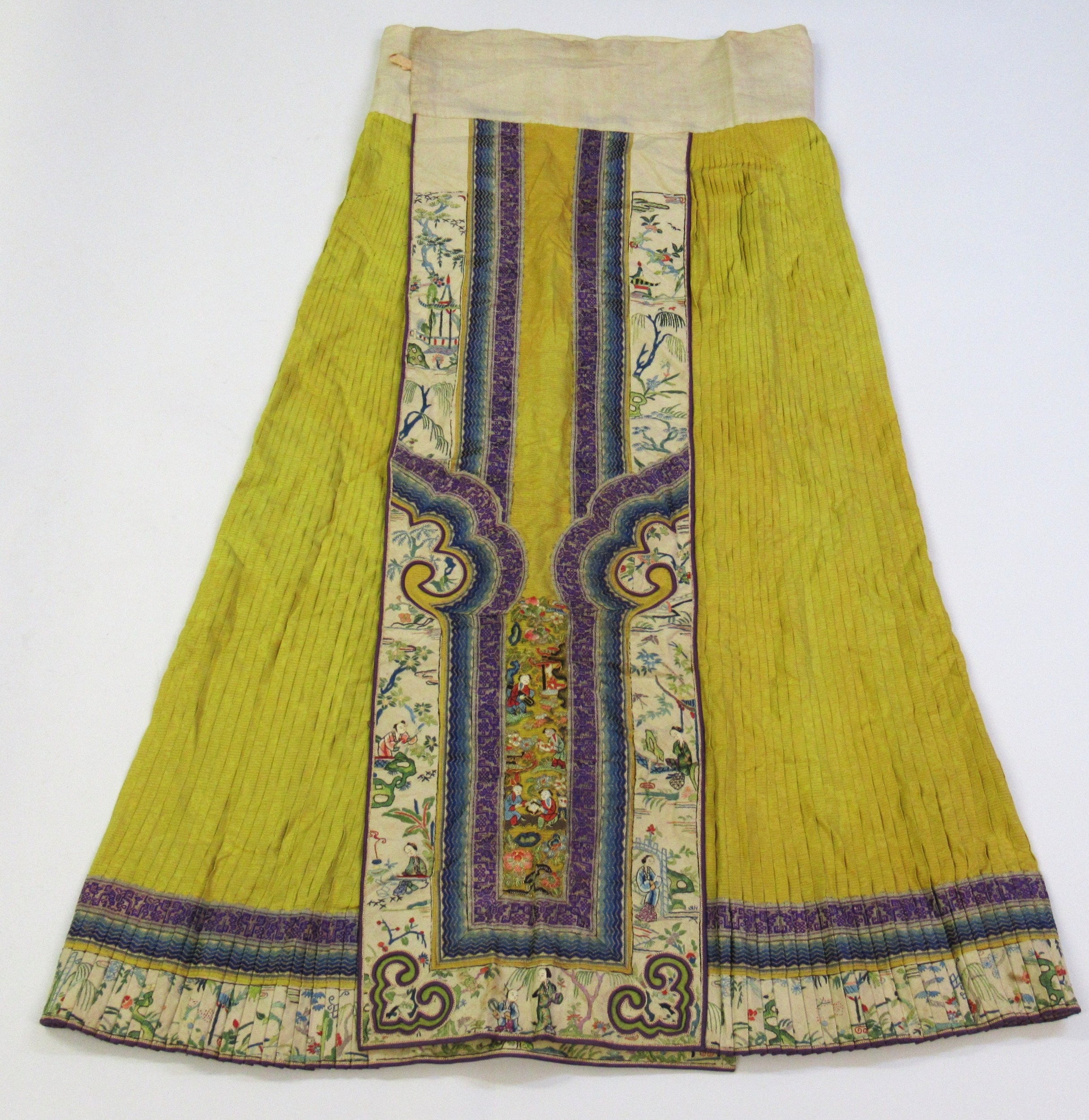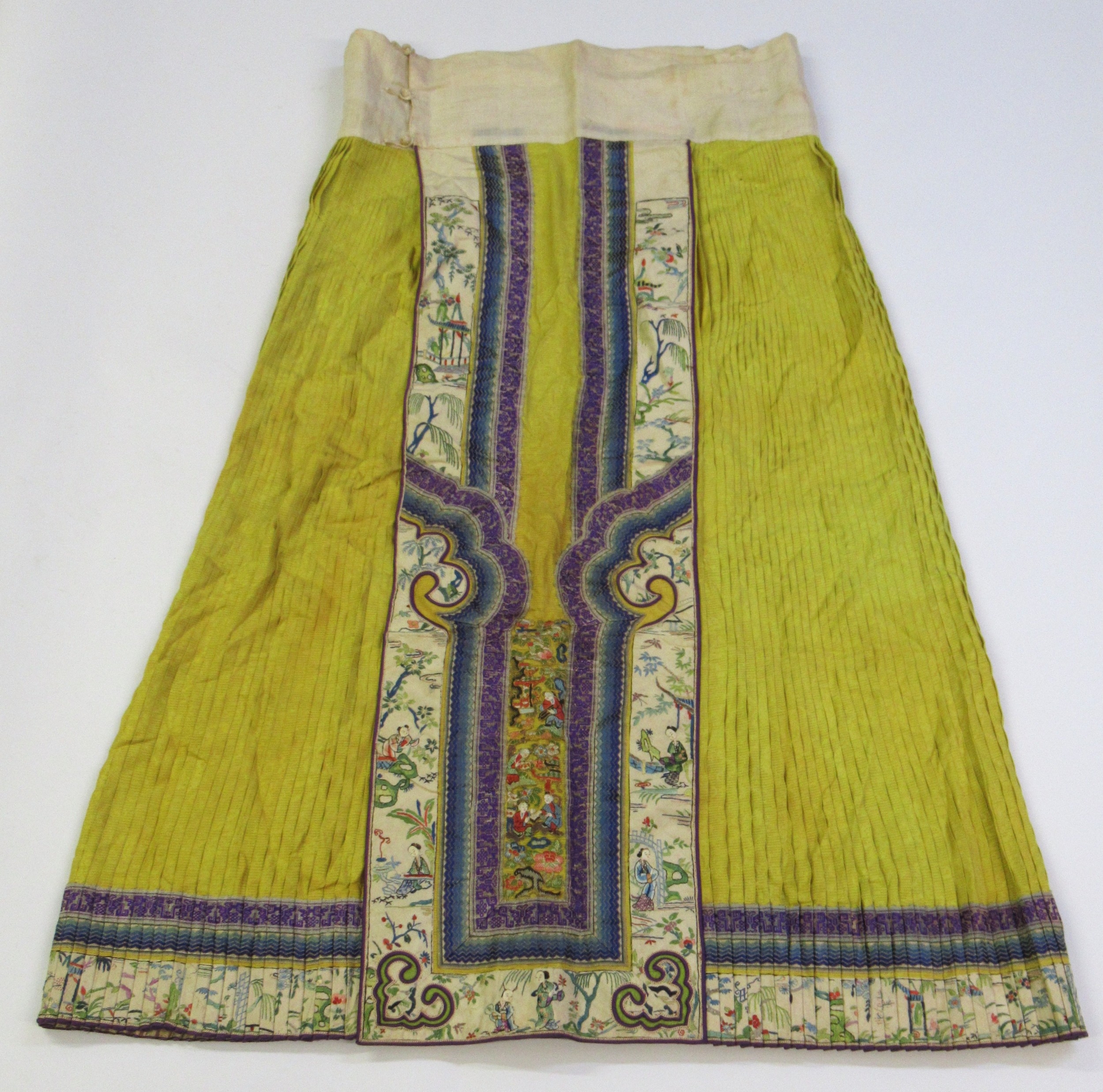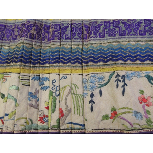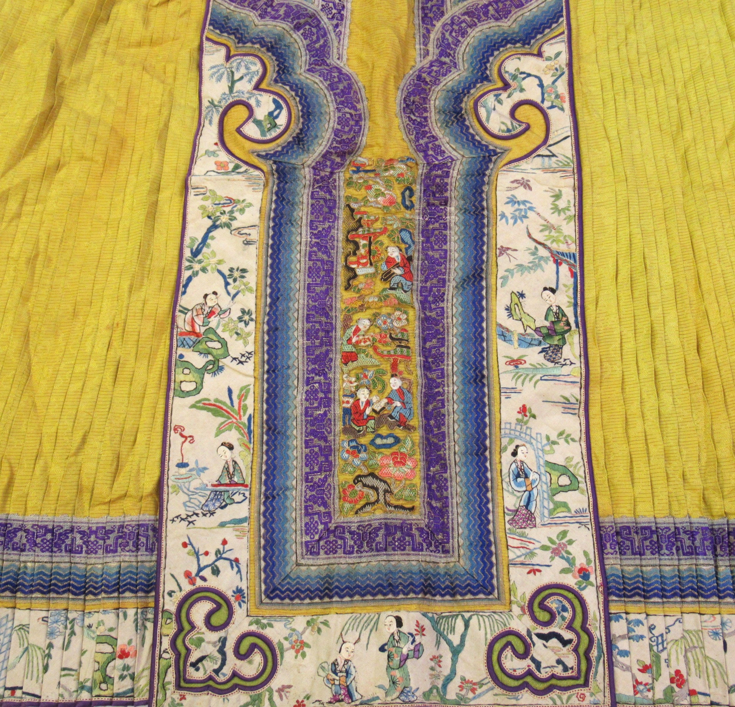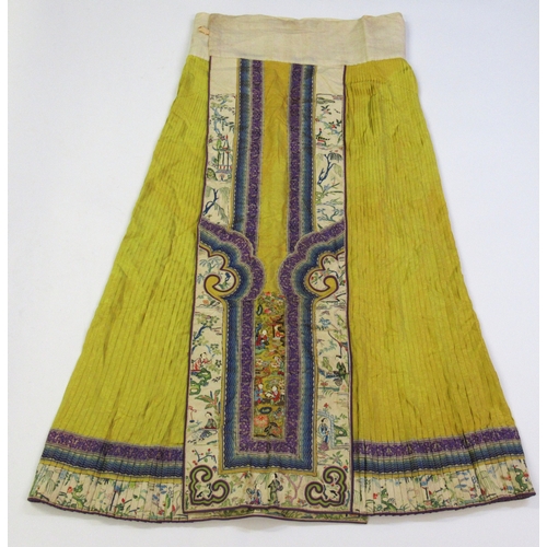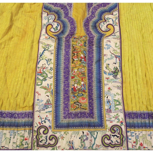 Early 20th Century Chinese silk embroidered skirt decorated with various panels of figures, trees and flowers, on a pleated gold ground