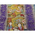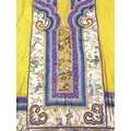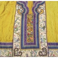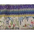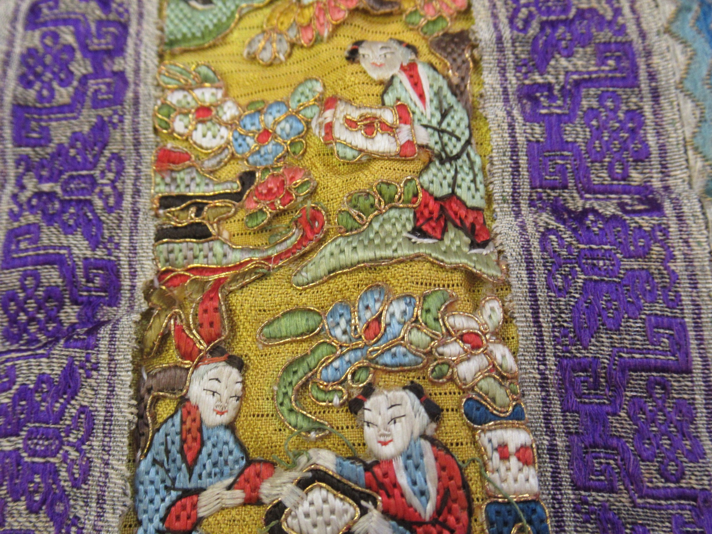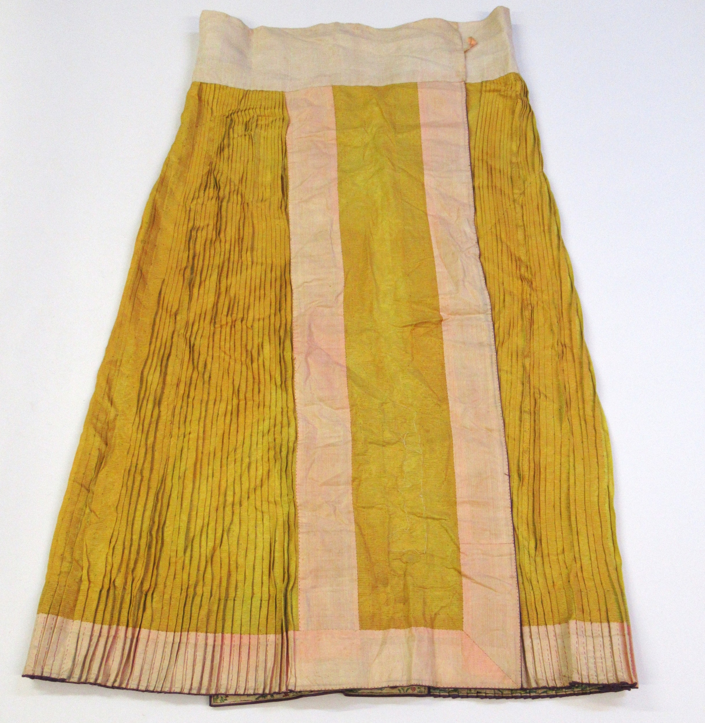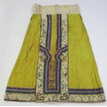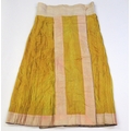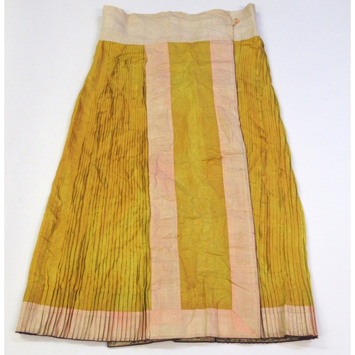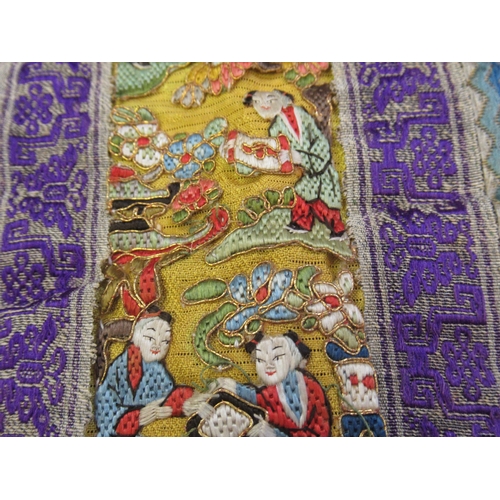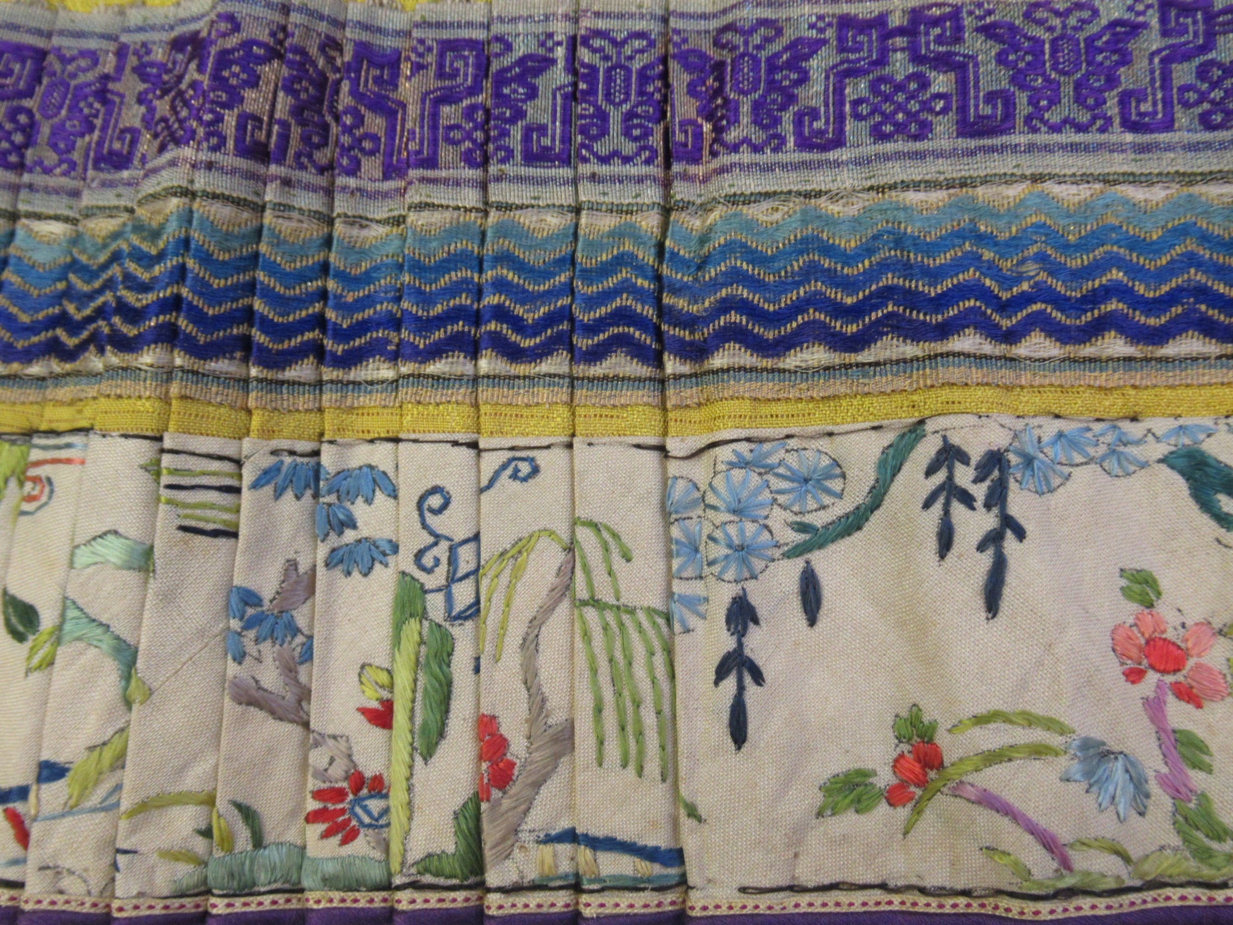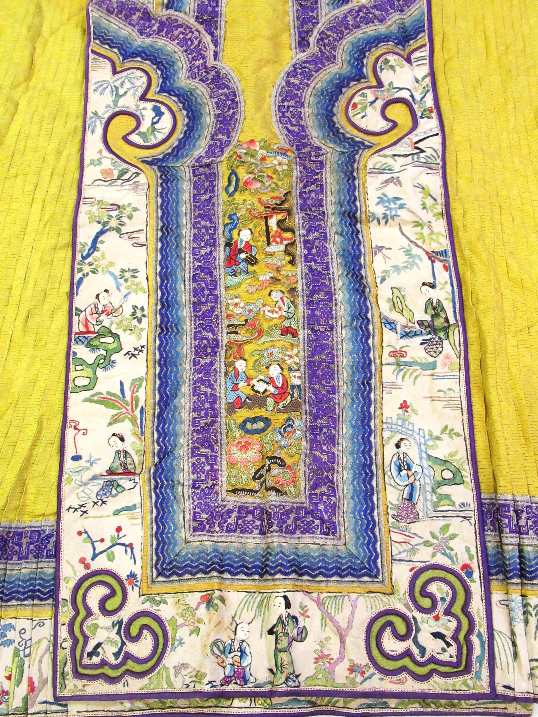 Early 20th Century Chinese silk embroidered skirt decorated with various panels of figures, trees and flowers, on a pleated gold ground