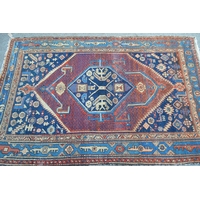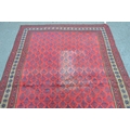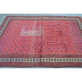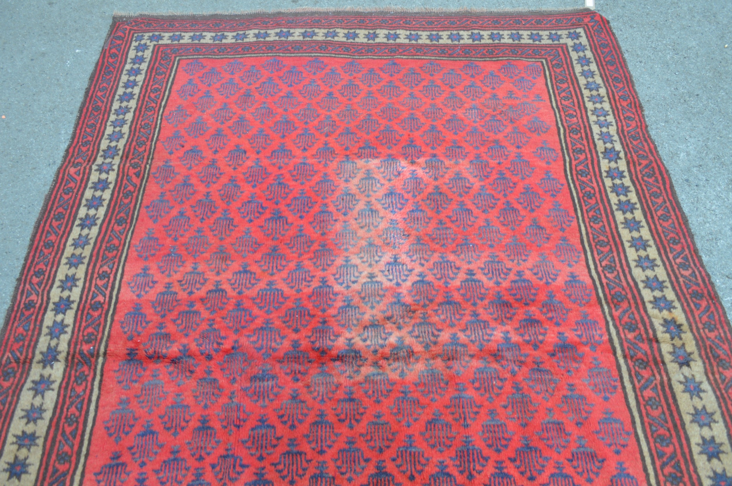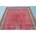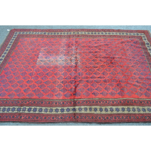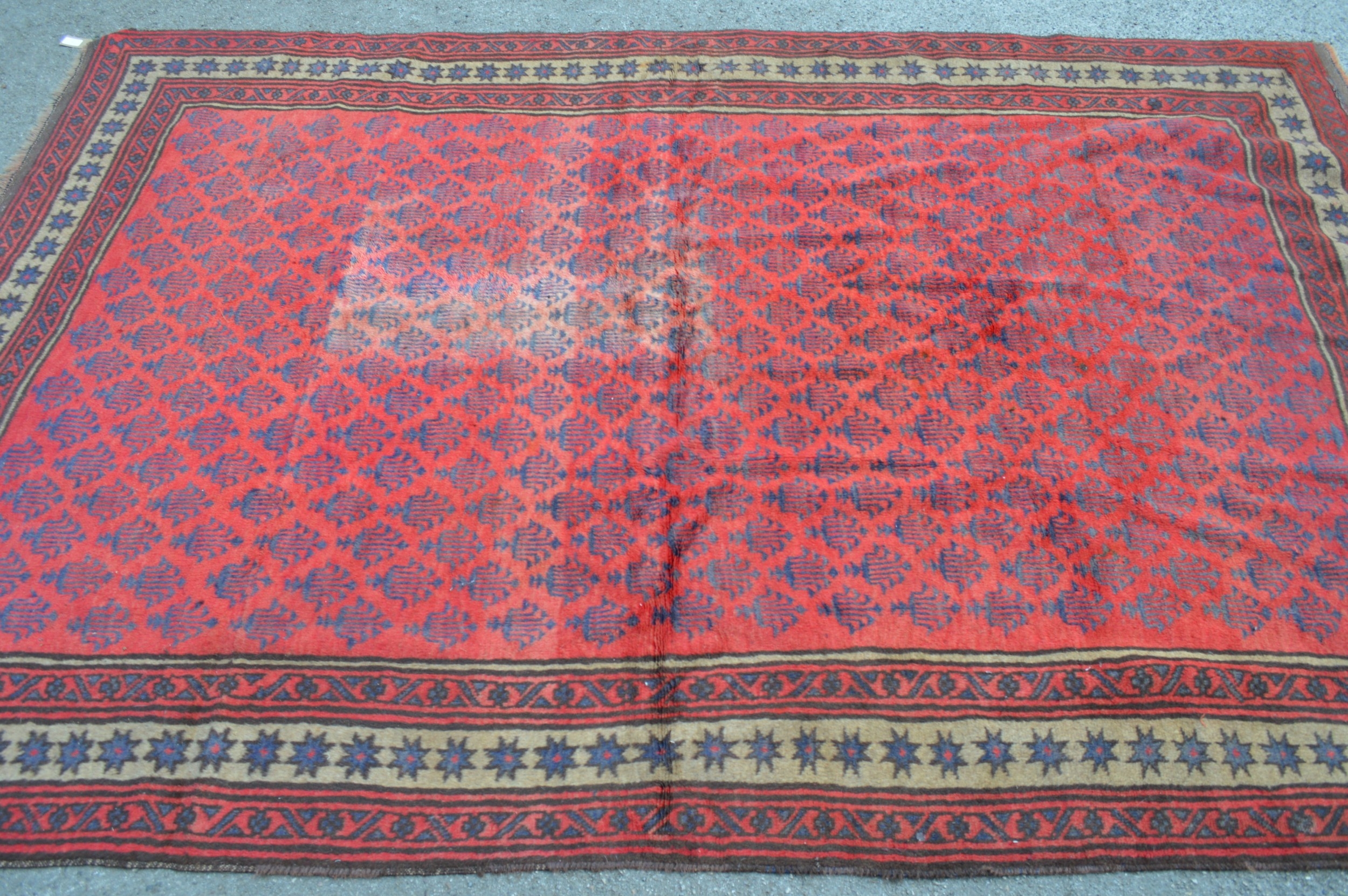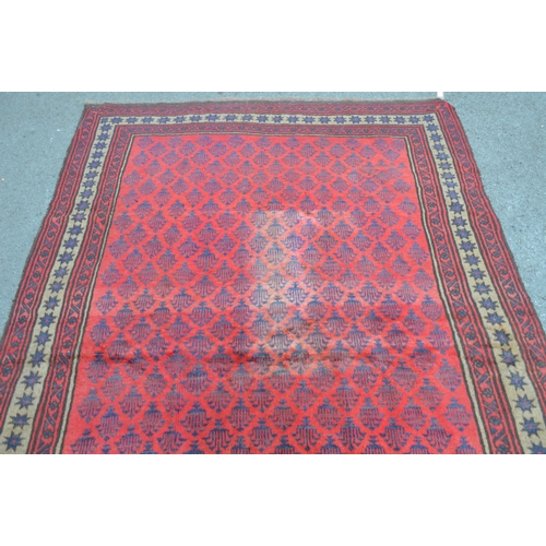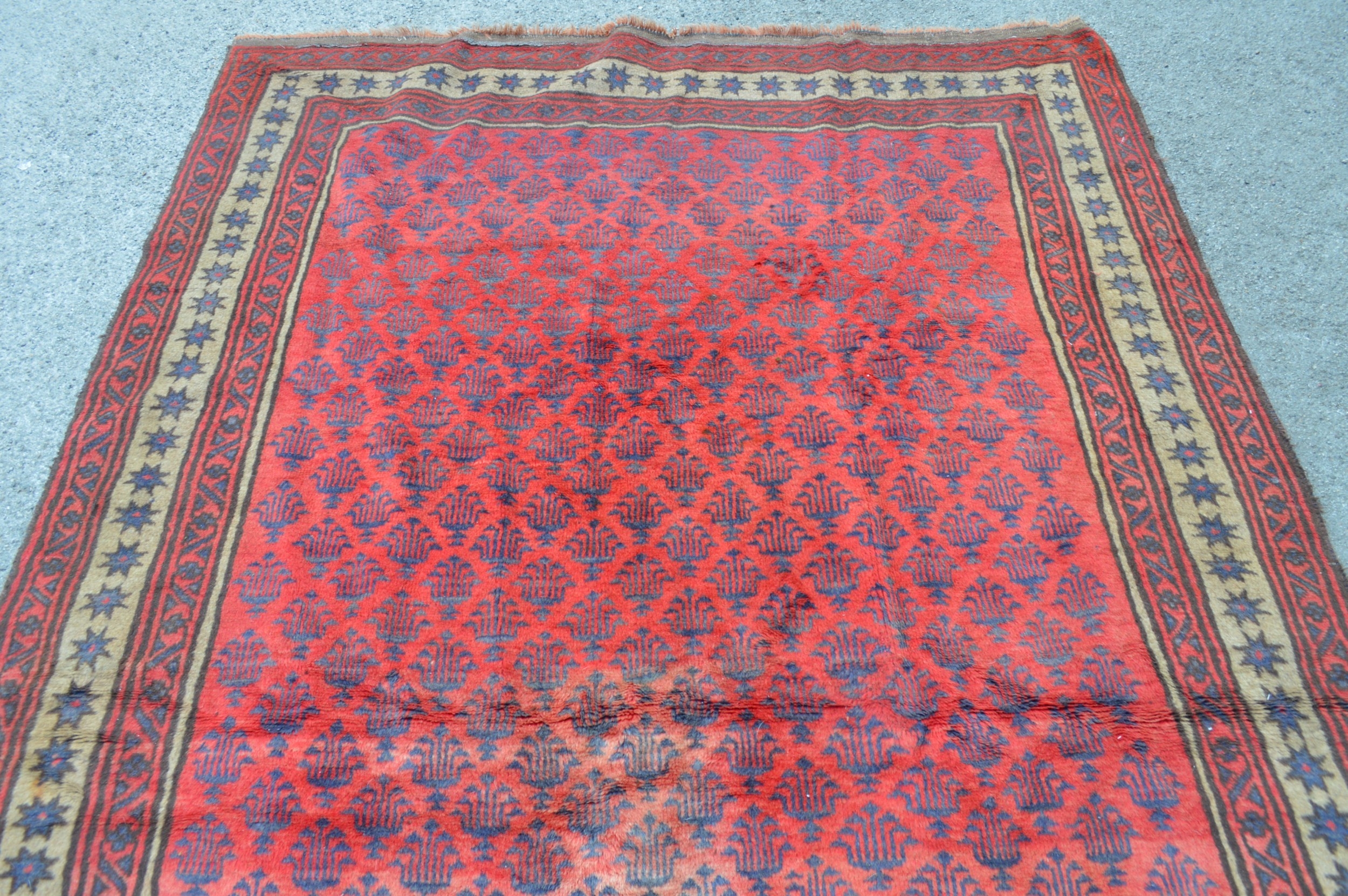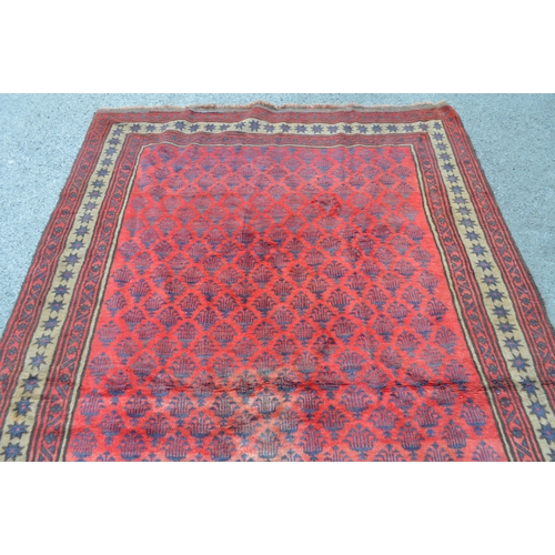 Belouch carpet with an all-over stylised flowerhead design on a red ground with star pattern border, 266 x 177cm