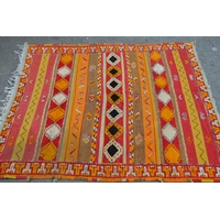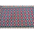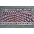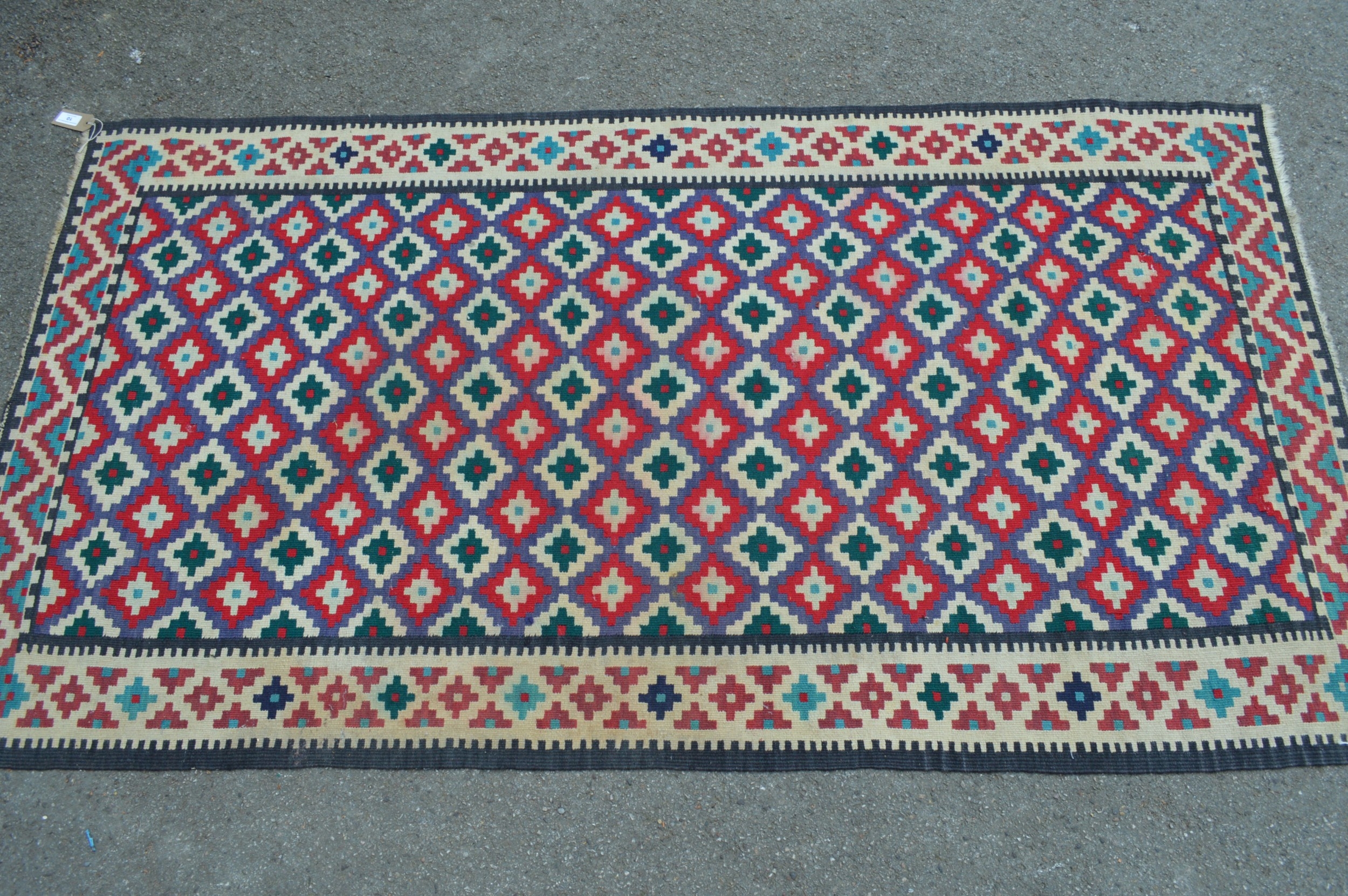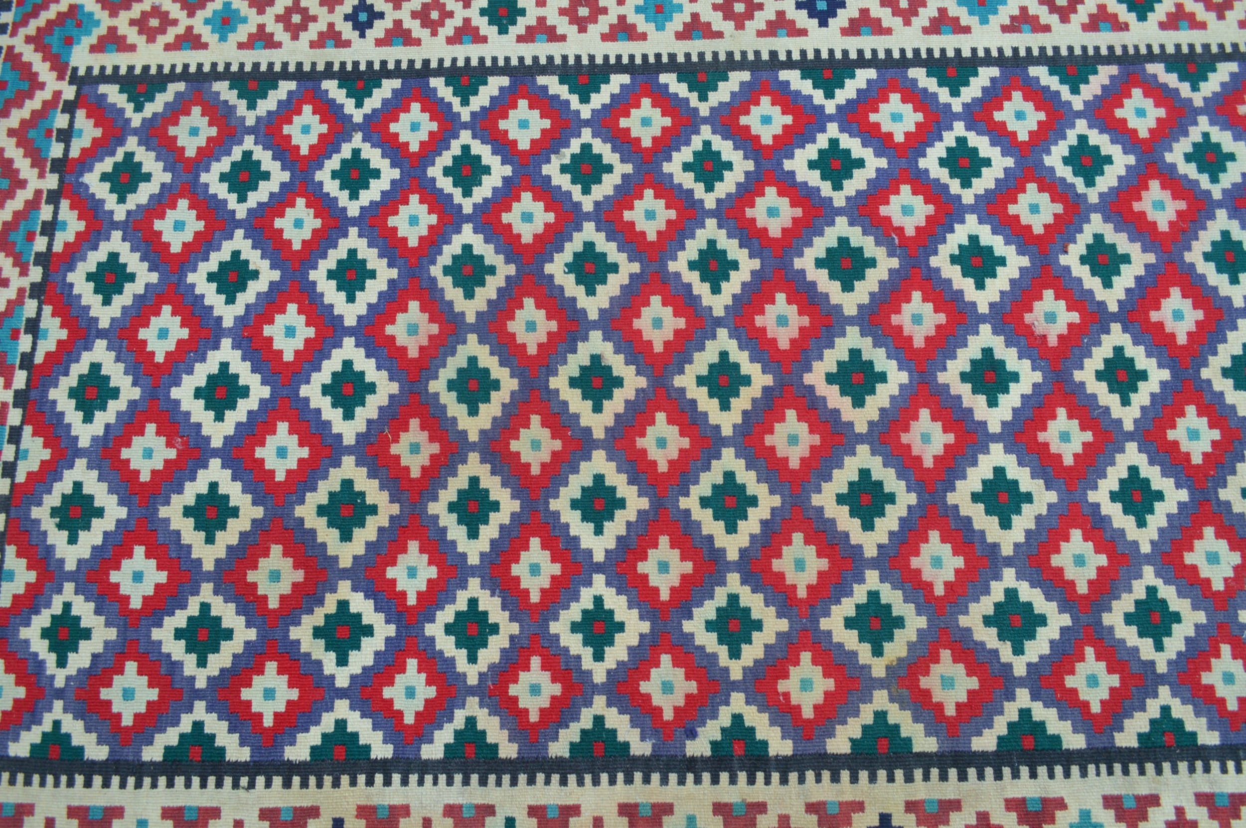 Small Kelim rug with an all-over stylised flowerhead design in shades of red, blue, green and cream, 188 x 103cm