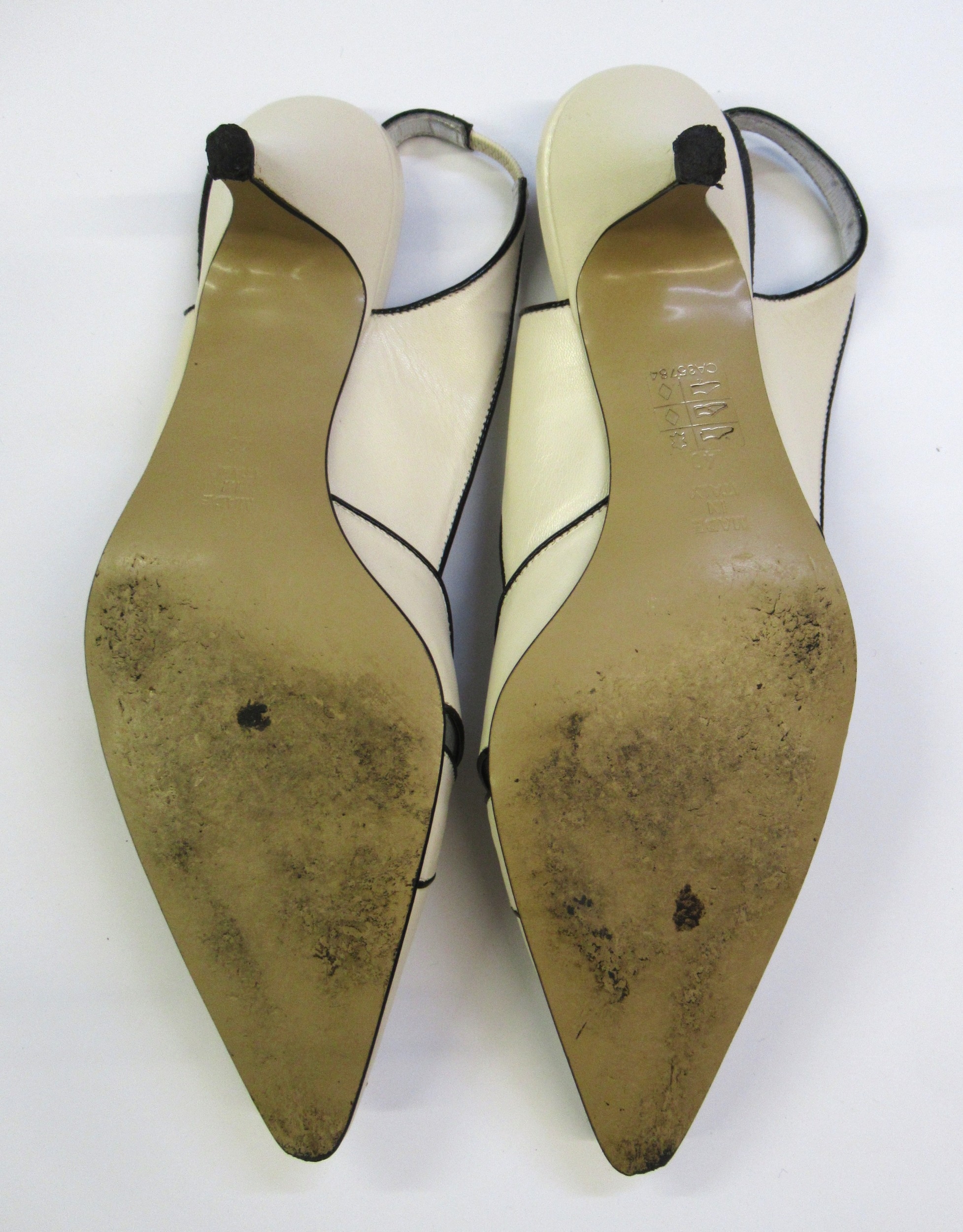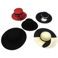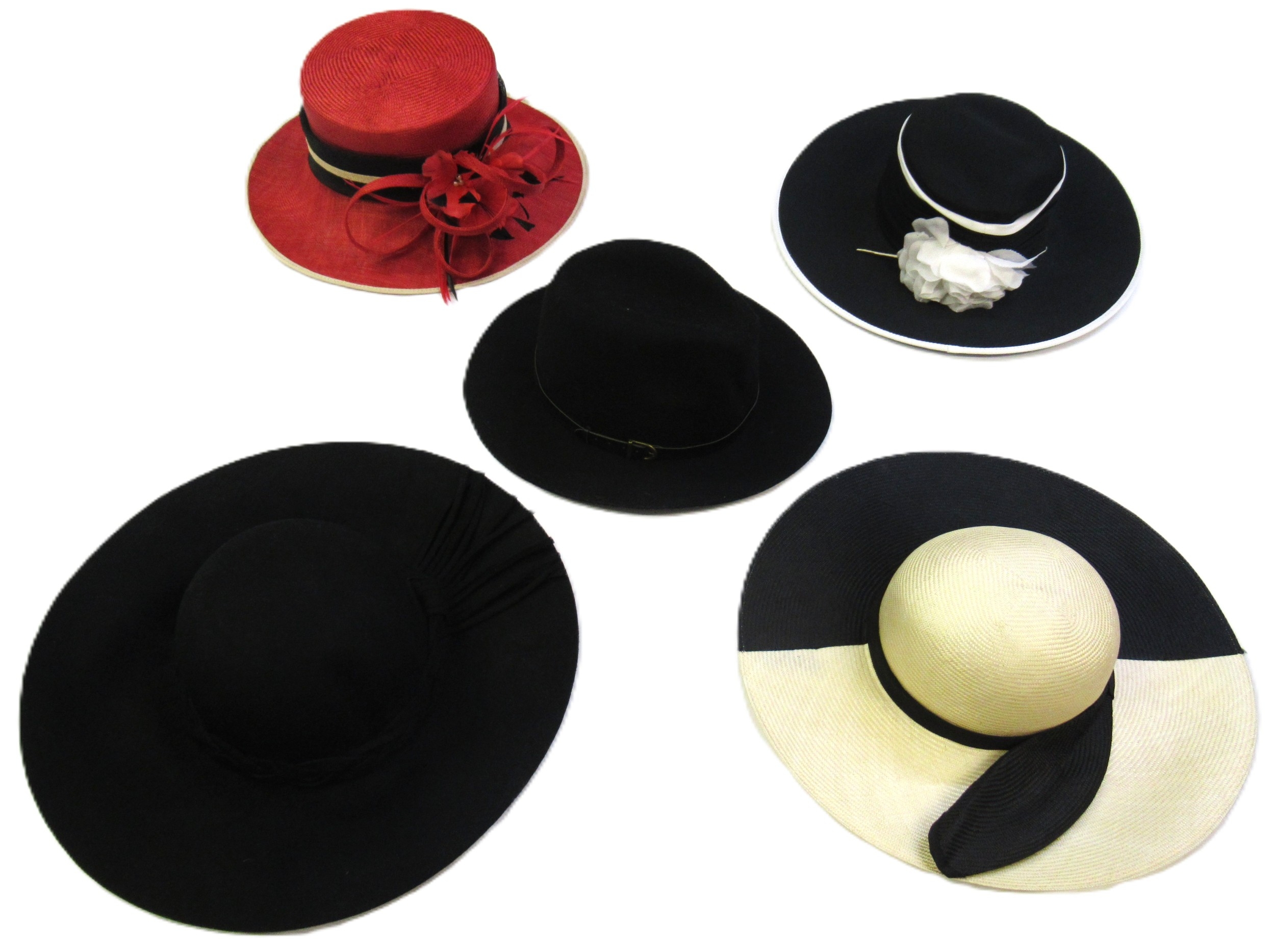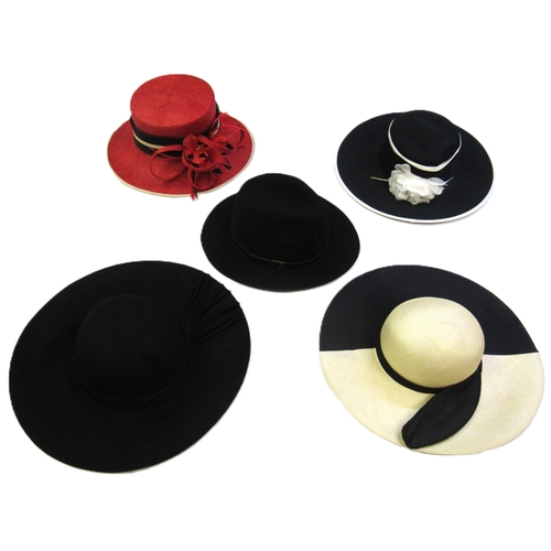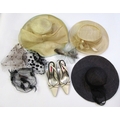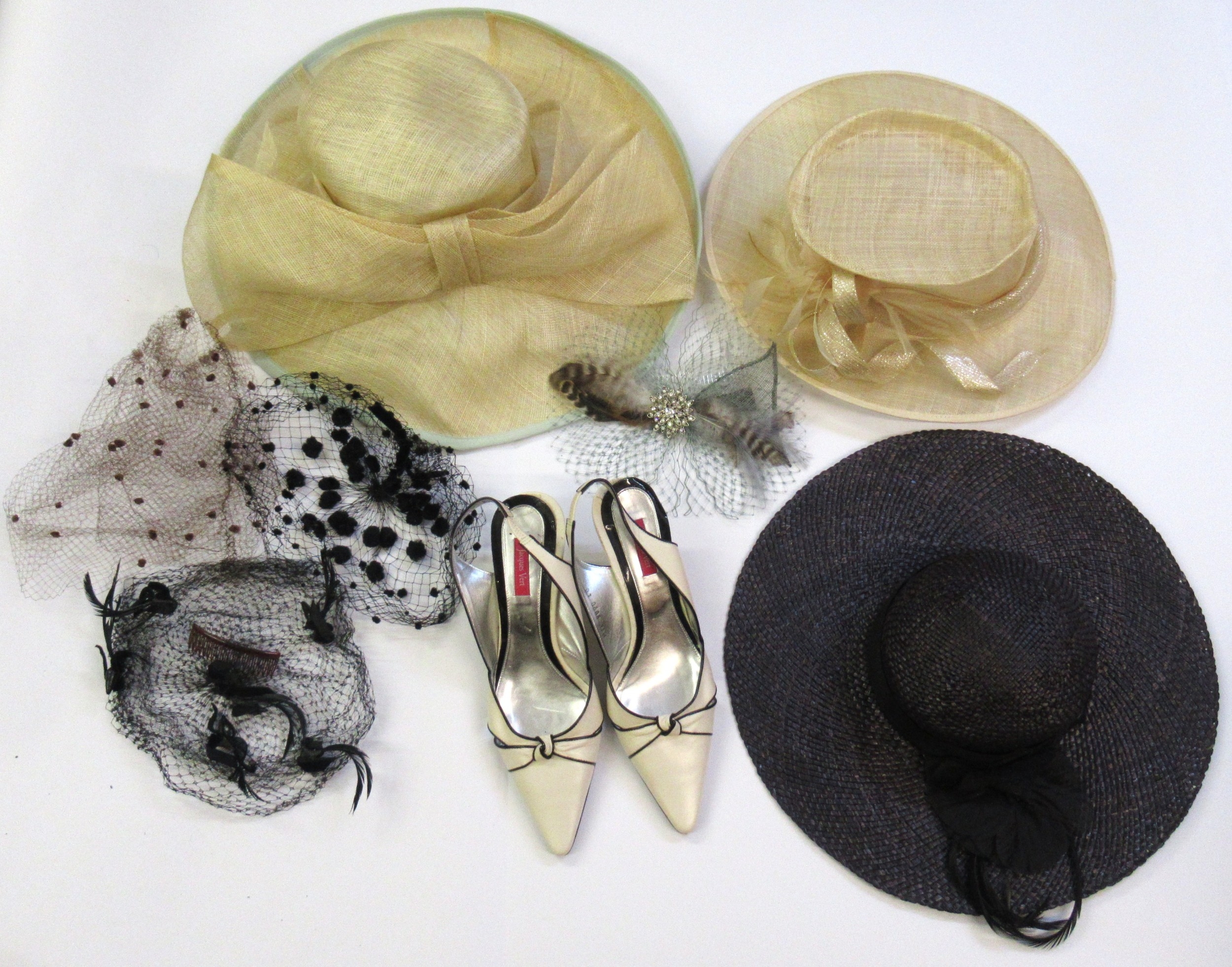 Two large hat boxes containing various hats and fascinators including Jacques Vert and Whiteley, together with a pair of Jacques Vert ladies shoes, size 40