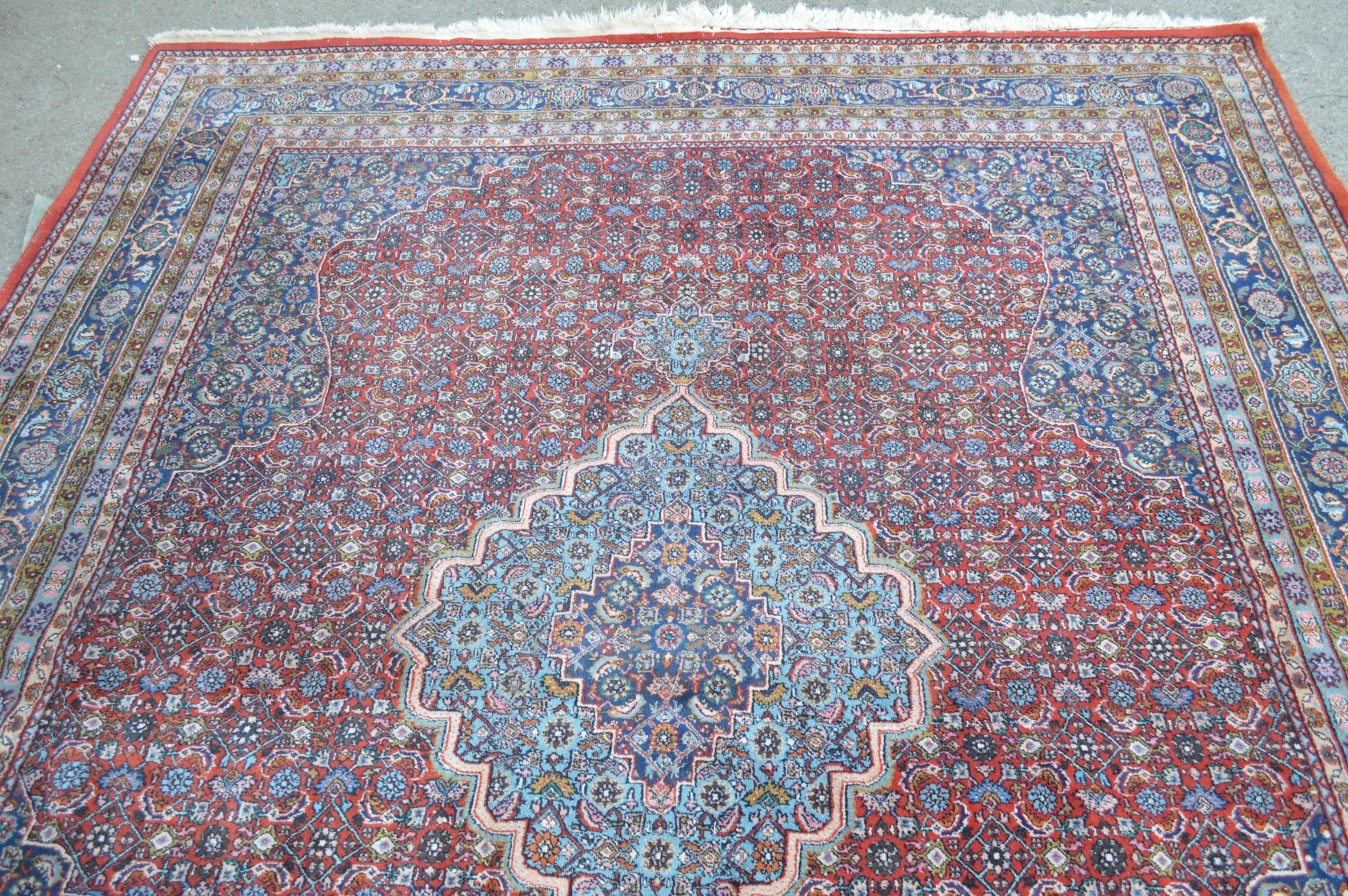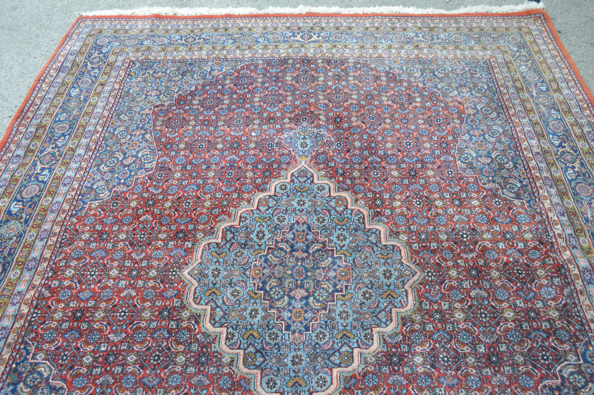 Indo Persian rug with a lobed medallion and all-over Herati design on a brick red ground with corner designs and borders, 293 x 234cm