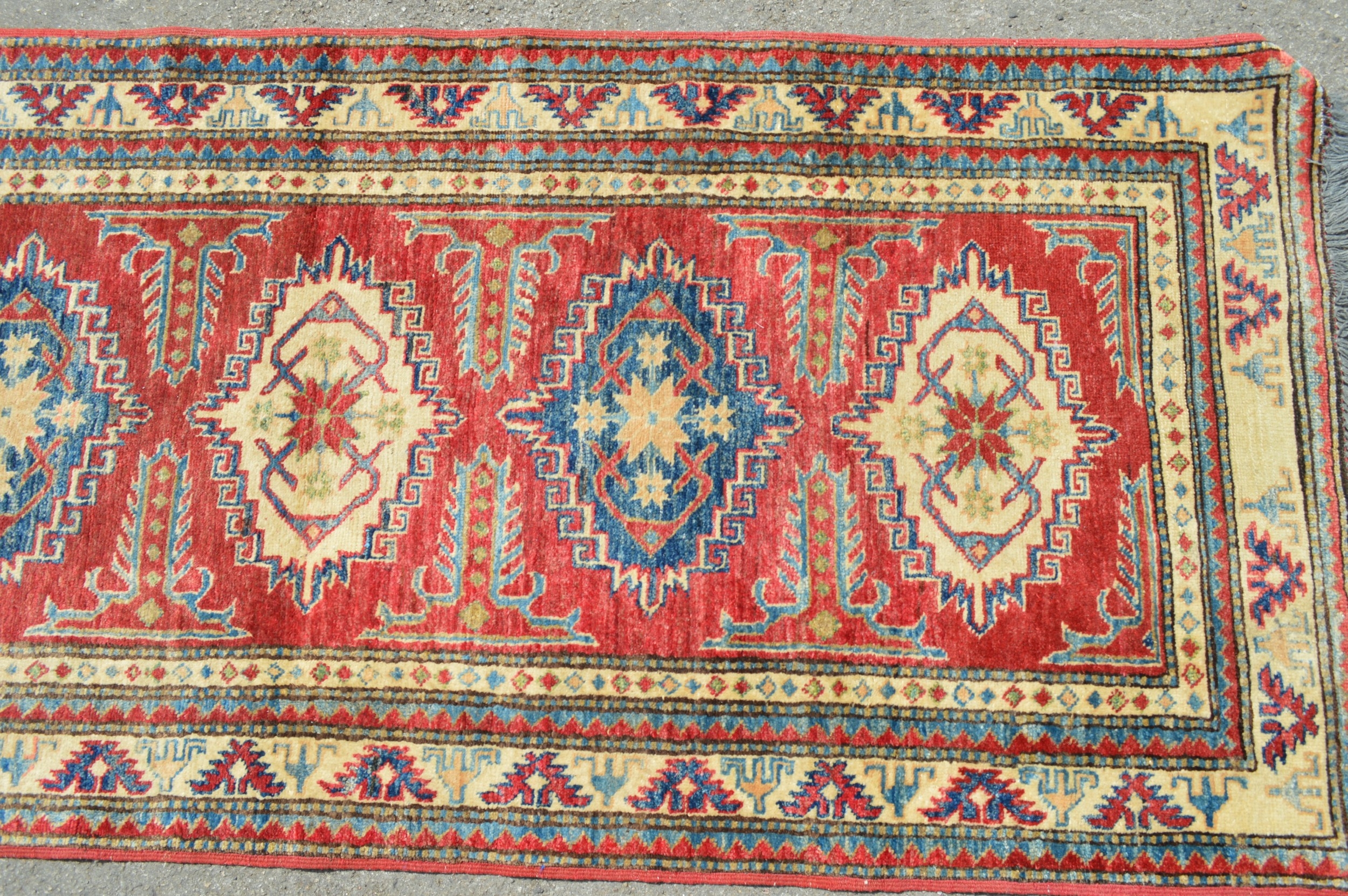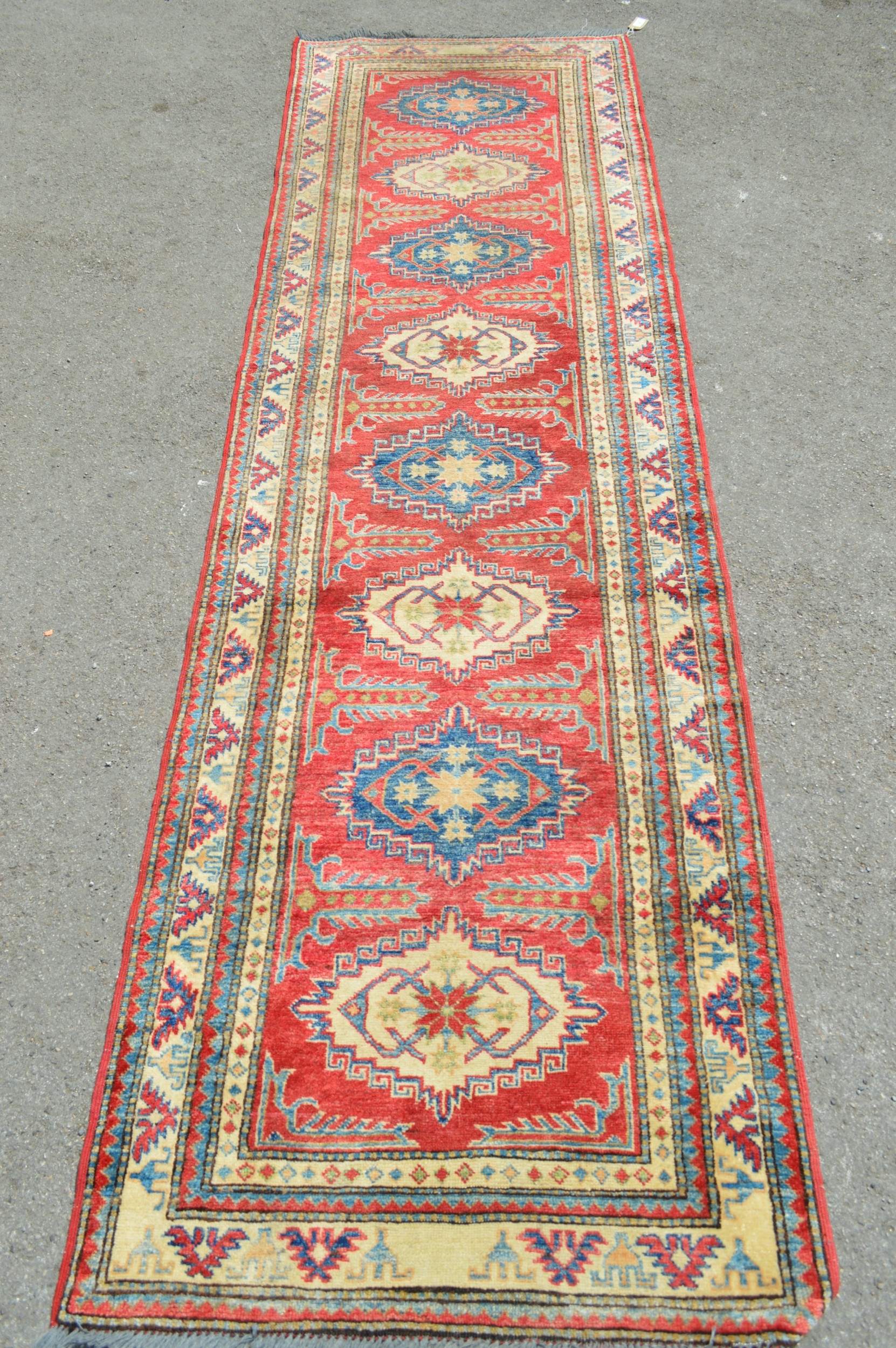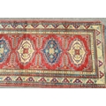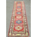 Indo Persian runner with a repeating hooked medallion design on a red ground with borders, 288 x 83cm