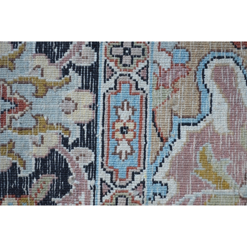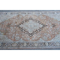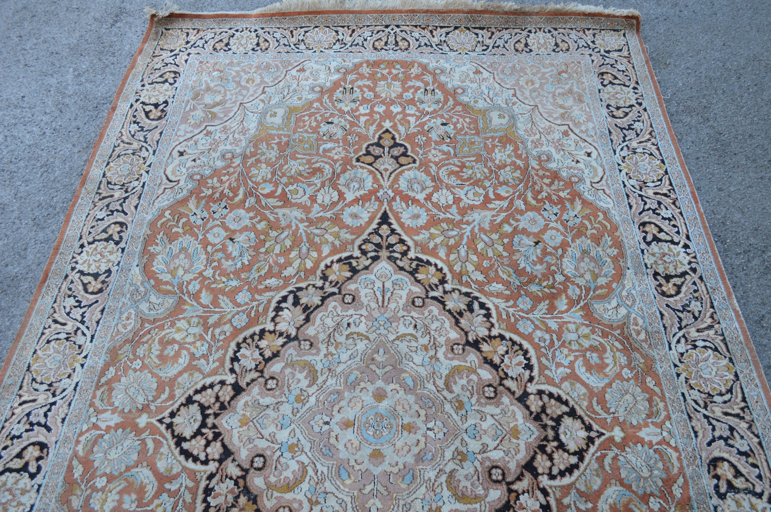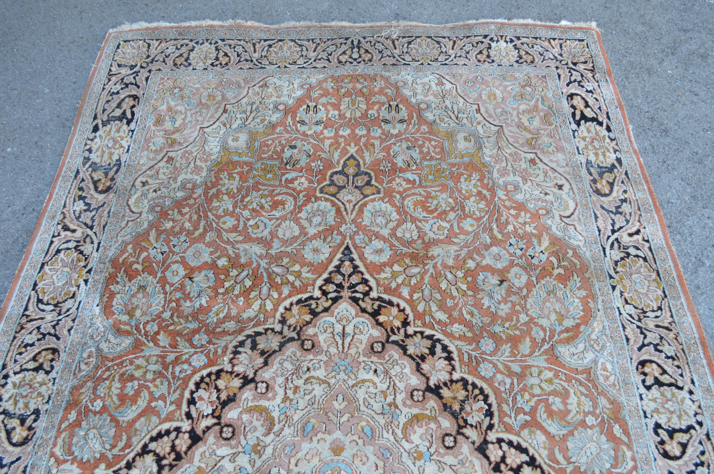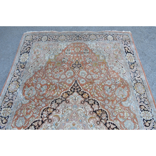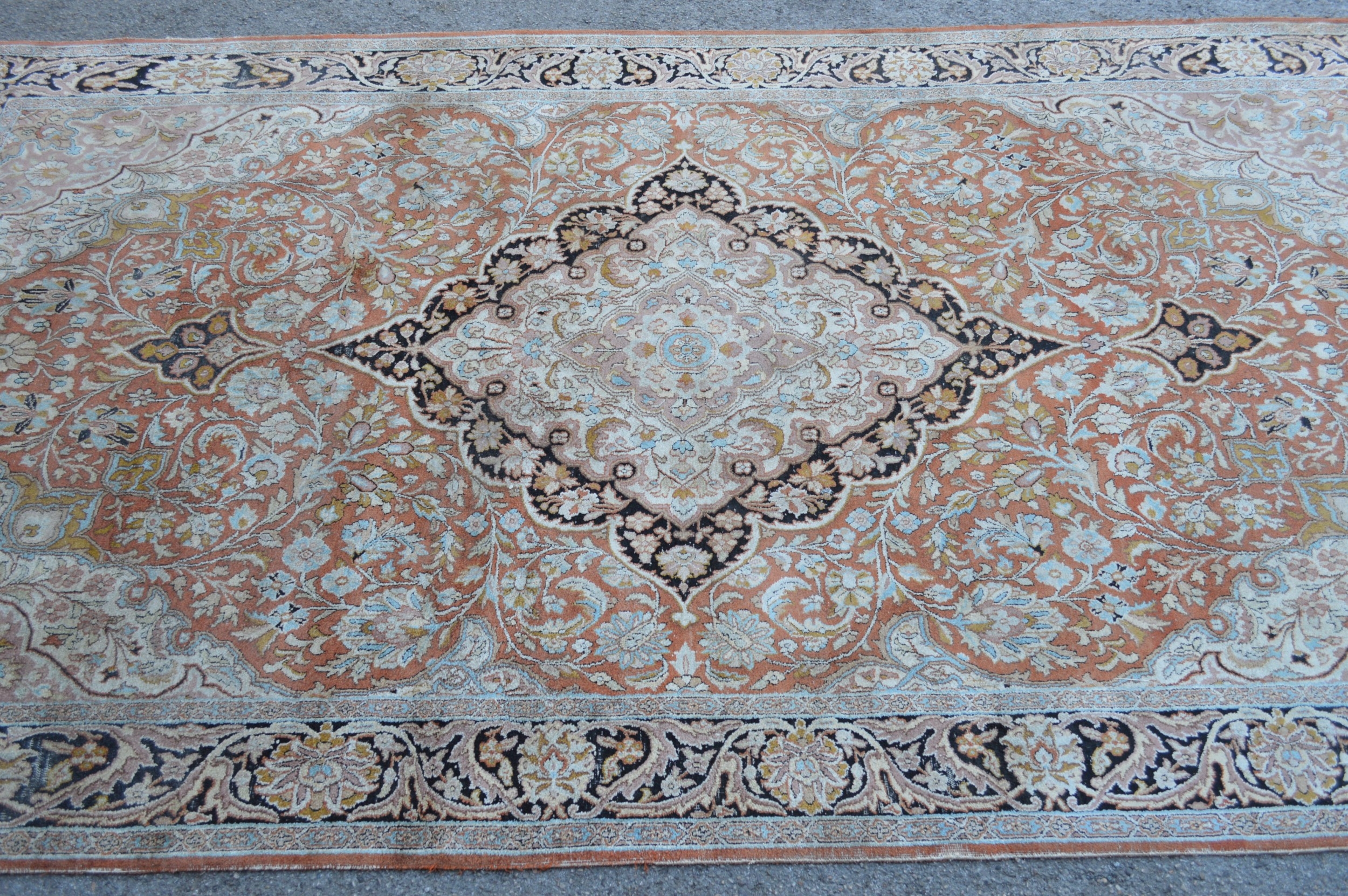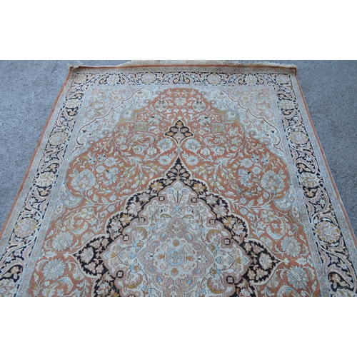 Cotton silk style Persian design rug with a lobed medallion and all-over floral design on a brick red ground with corner designs and borders, 280 x 154cm