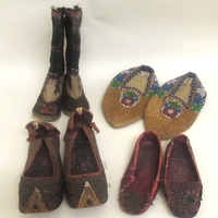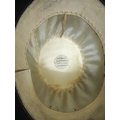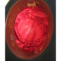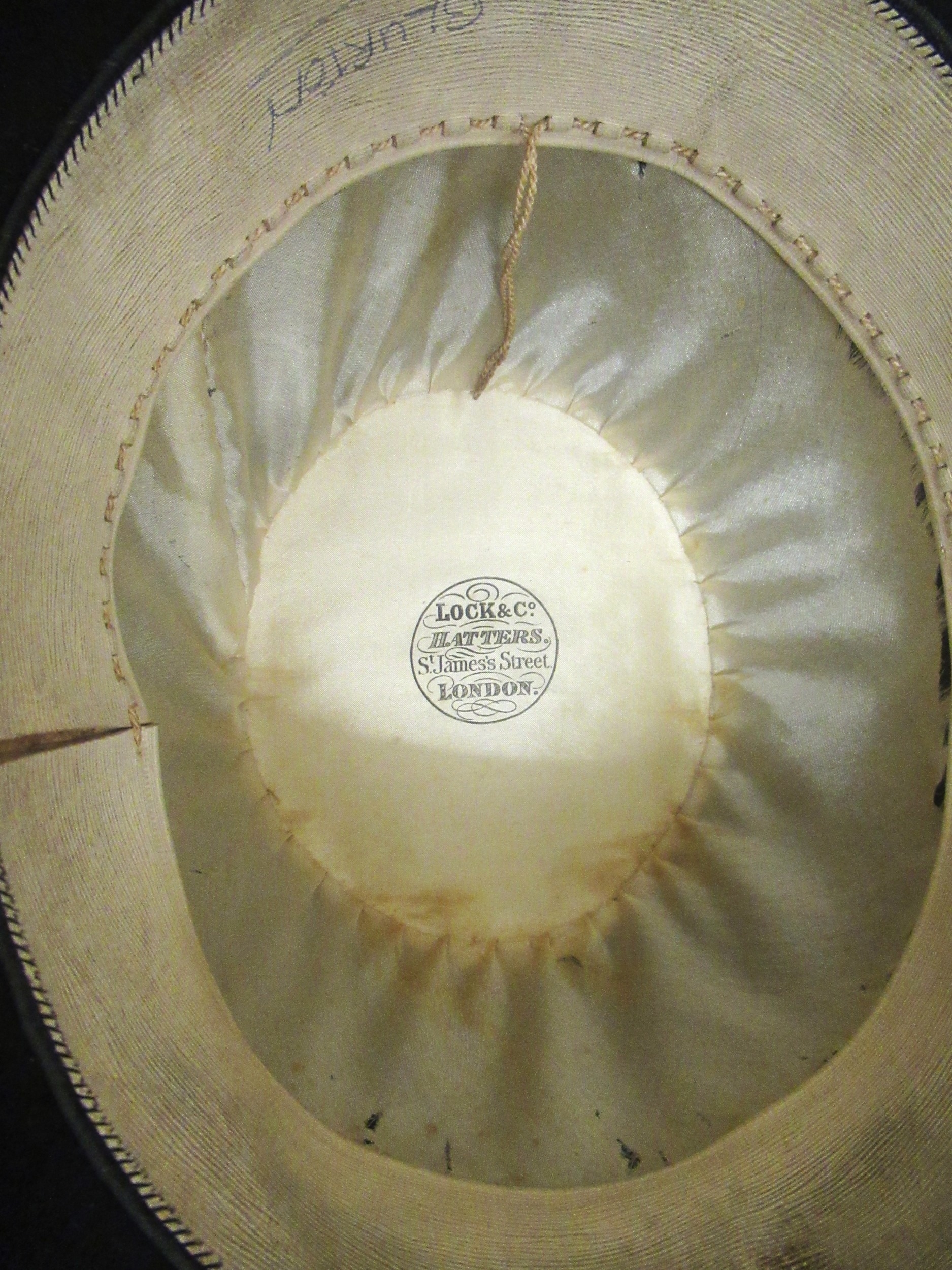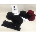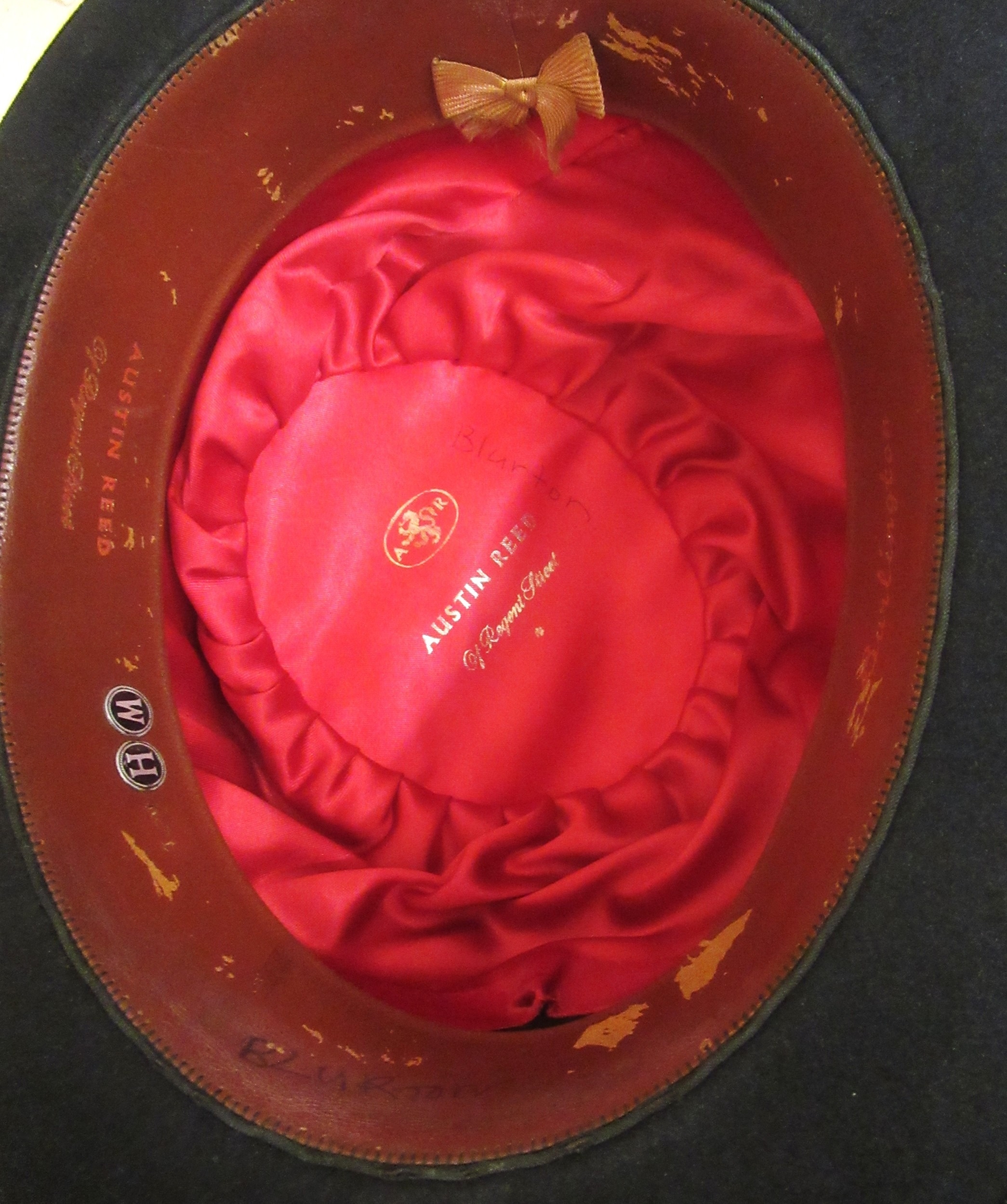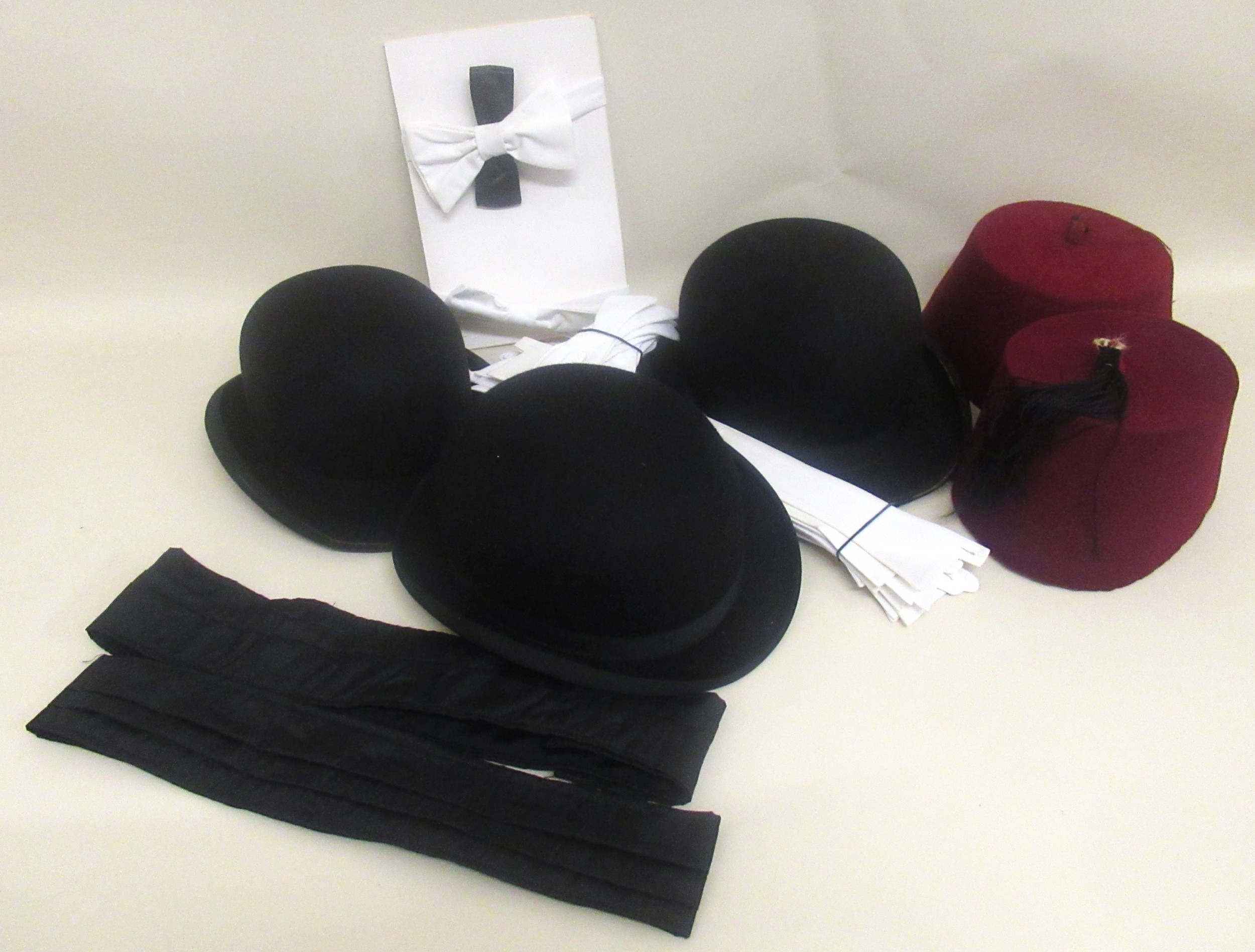 Vintage hat box containing three bowler hats, miscellaneous cummerbunds, ties, detachable collars, and two Turkish fez