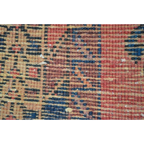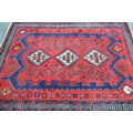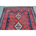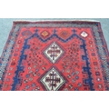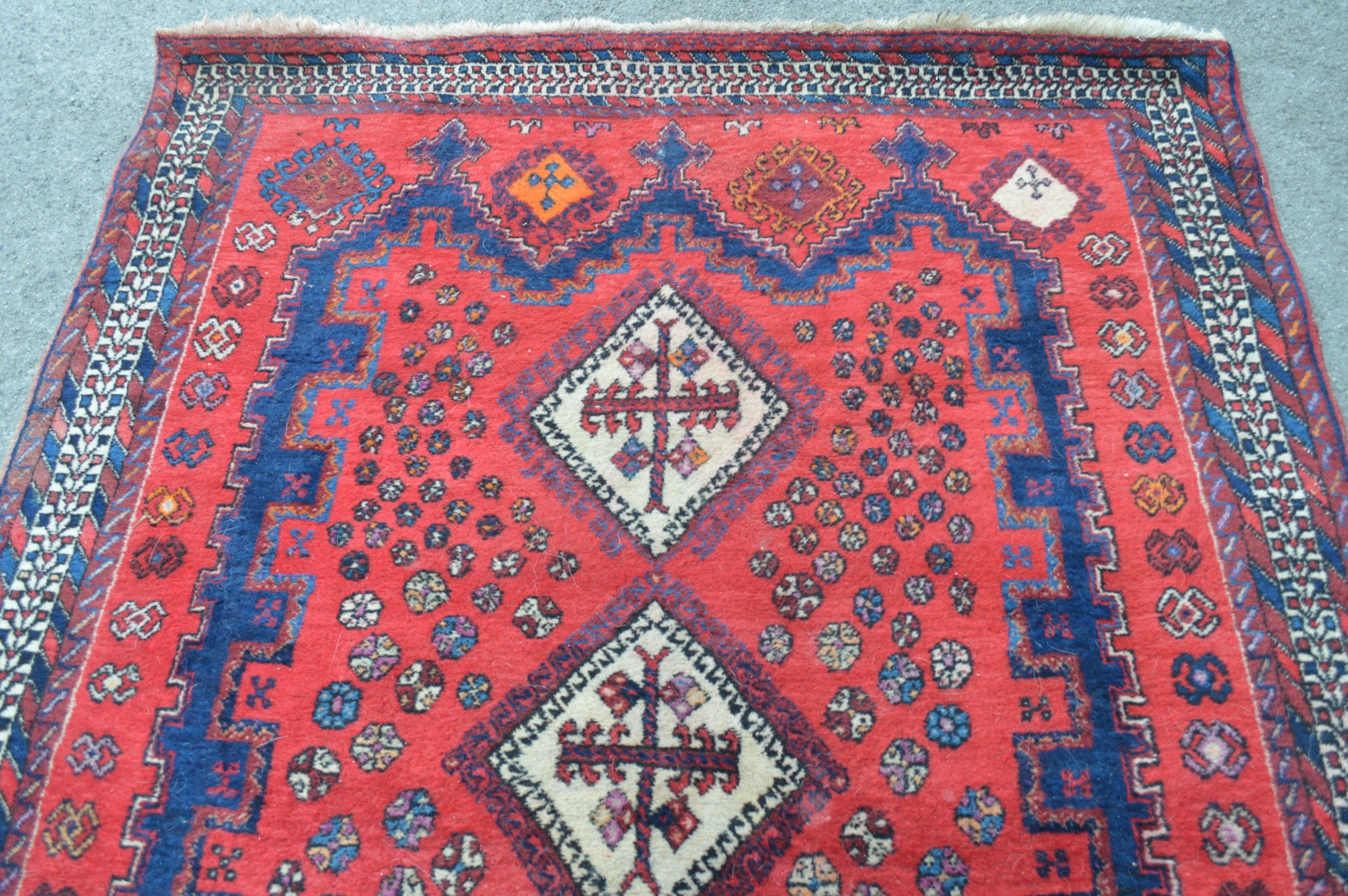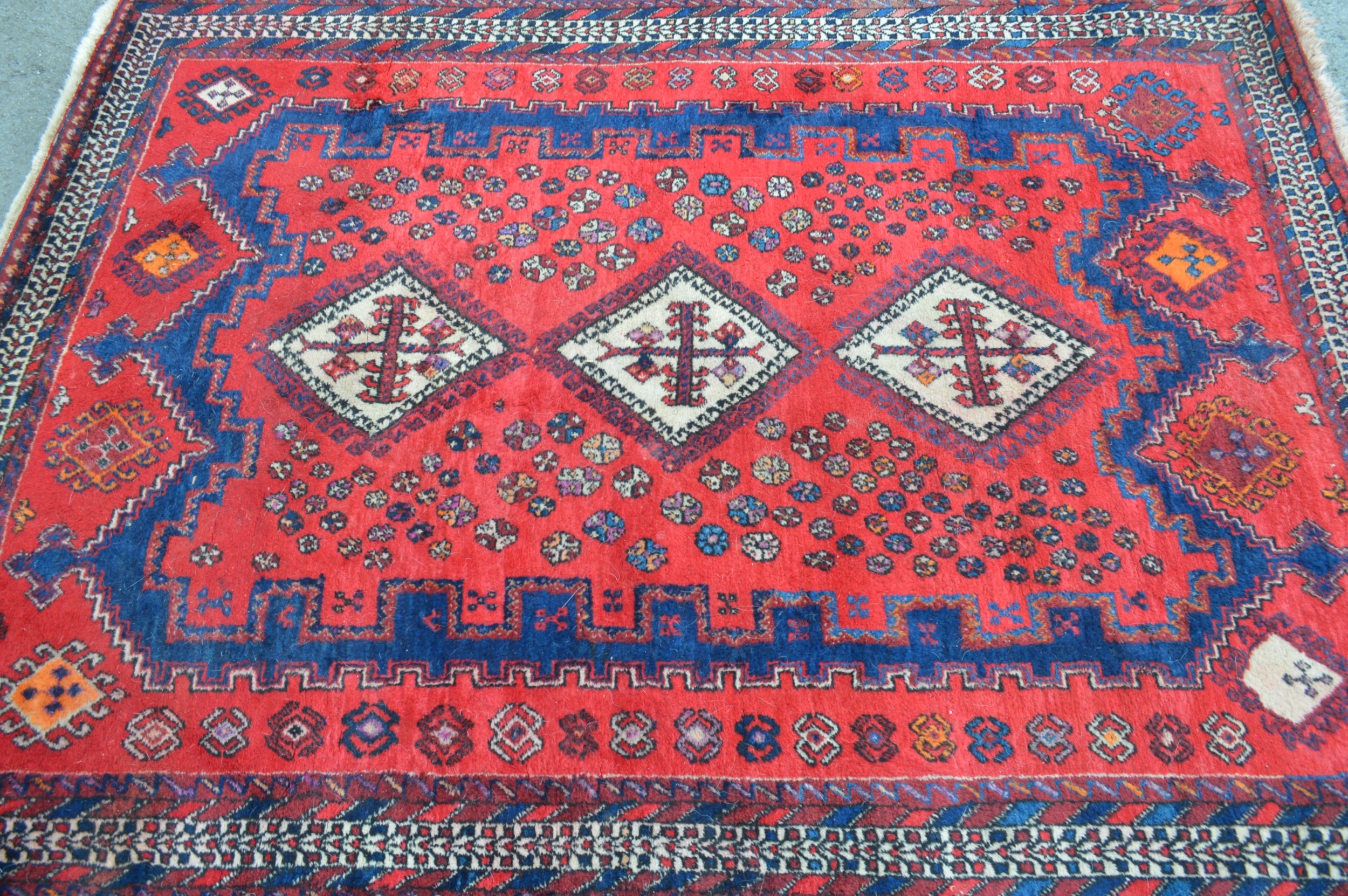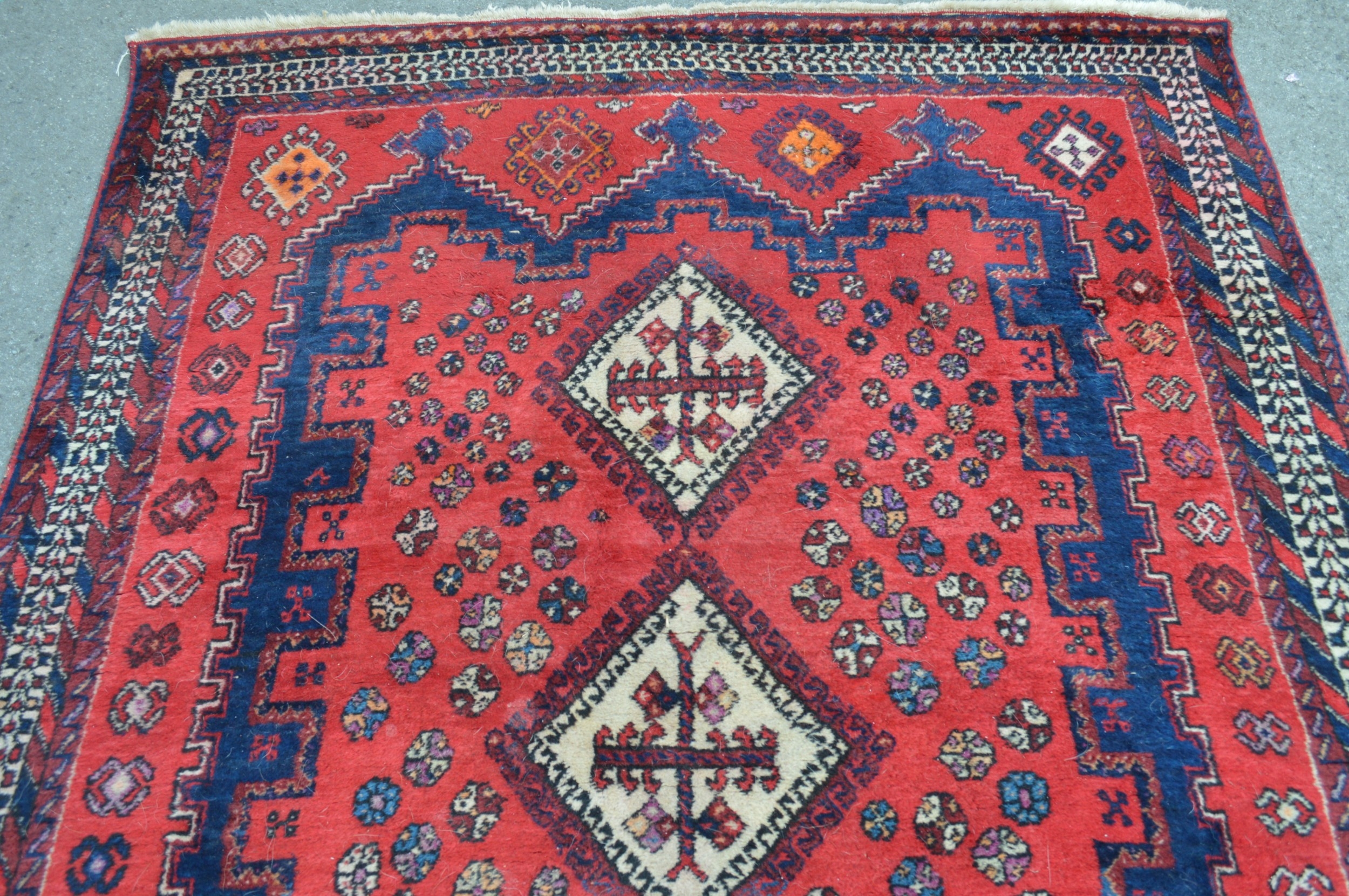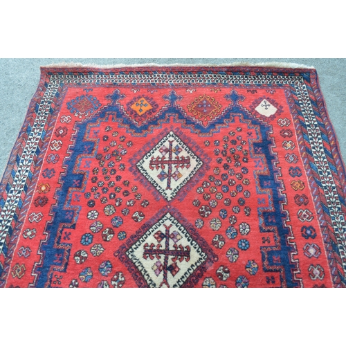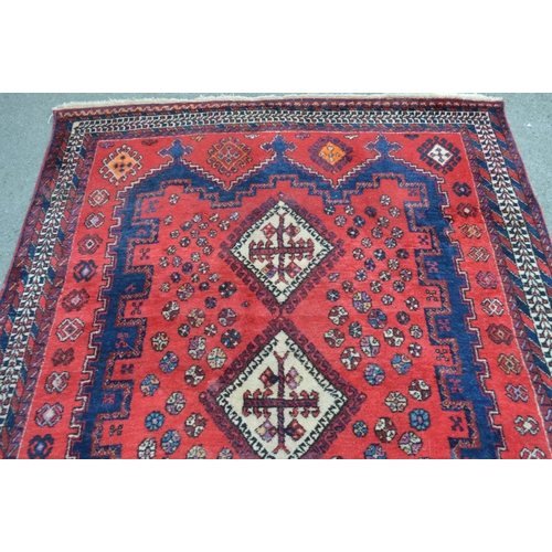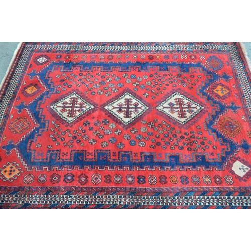 Shiraz rug with triple hooked medallion design on a red ground with borders, 218 x 160cm