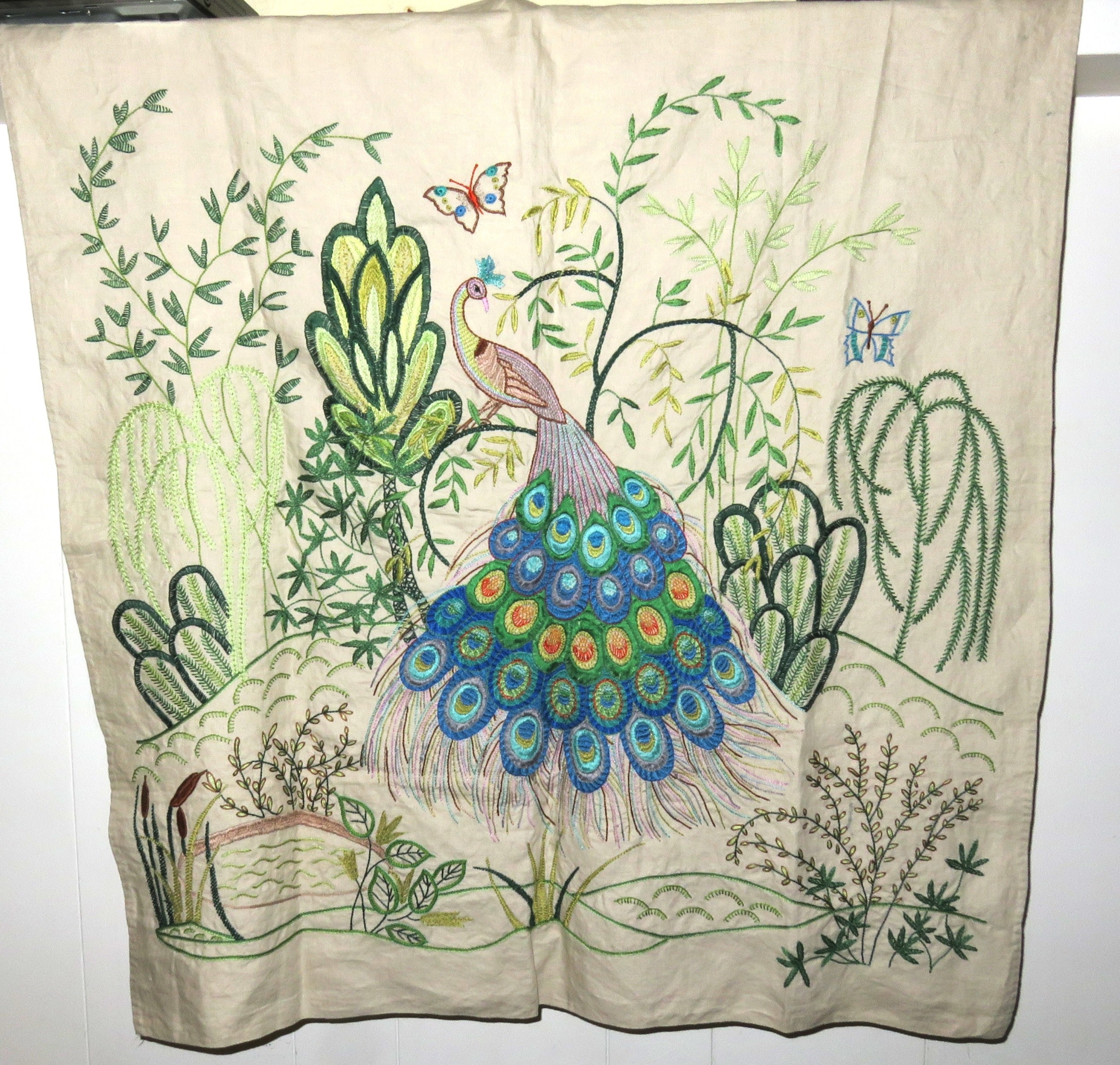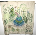 Mid 20th Century linen panel embroidered with a peacock, 90 ...