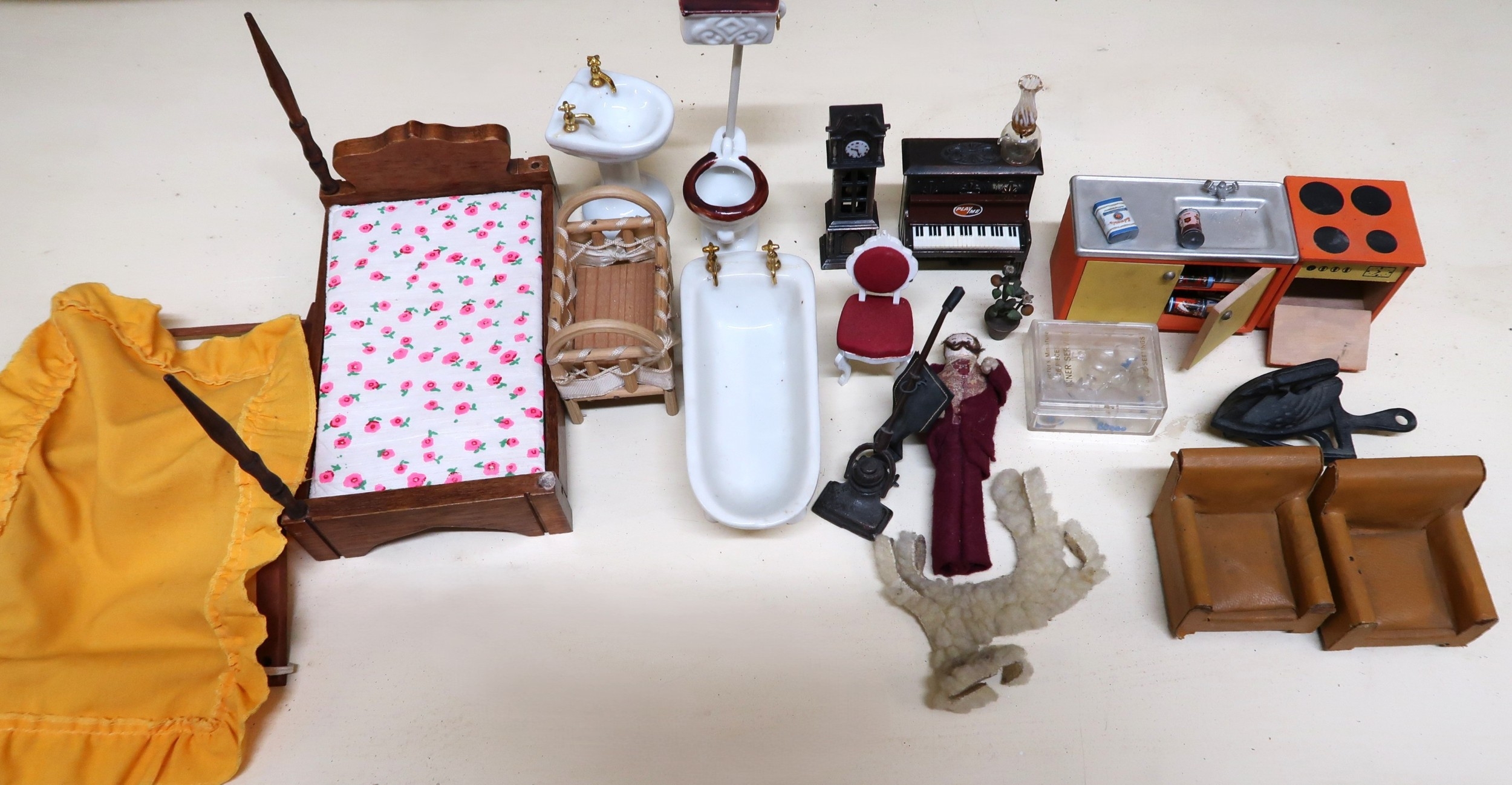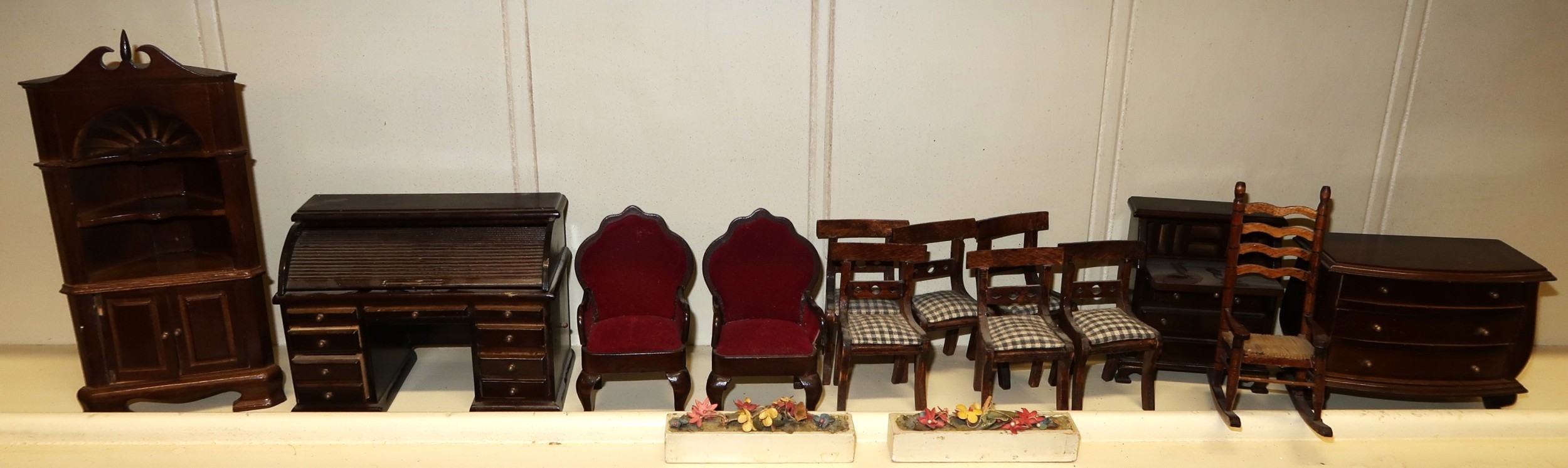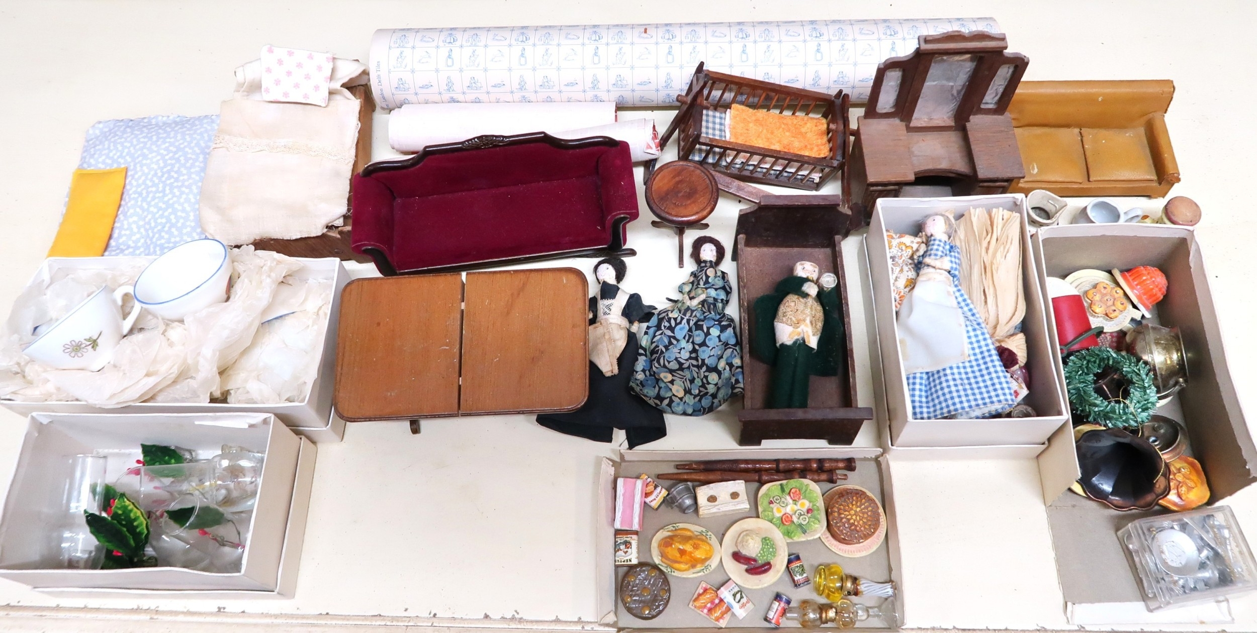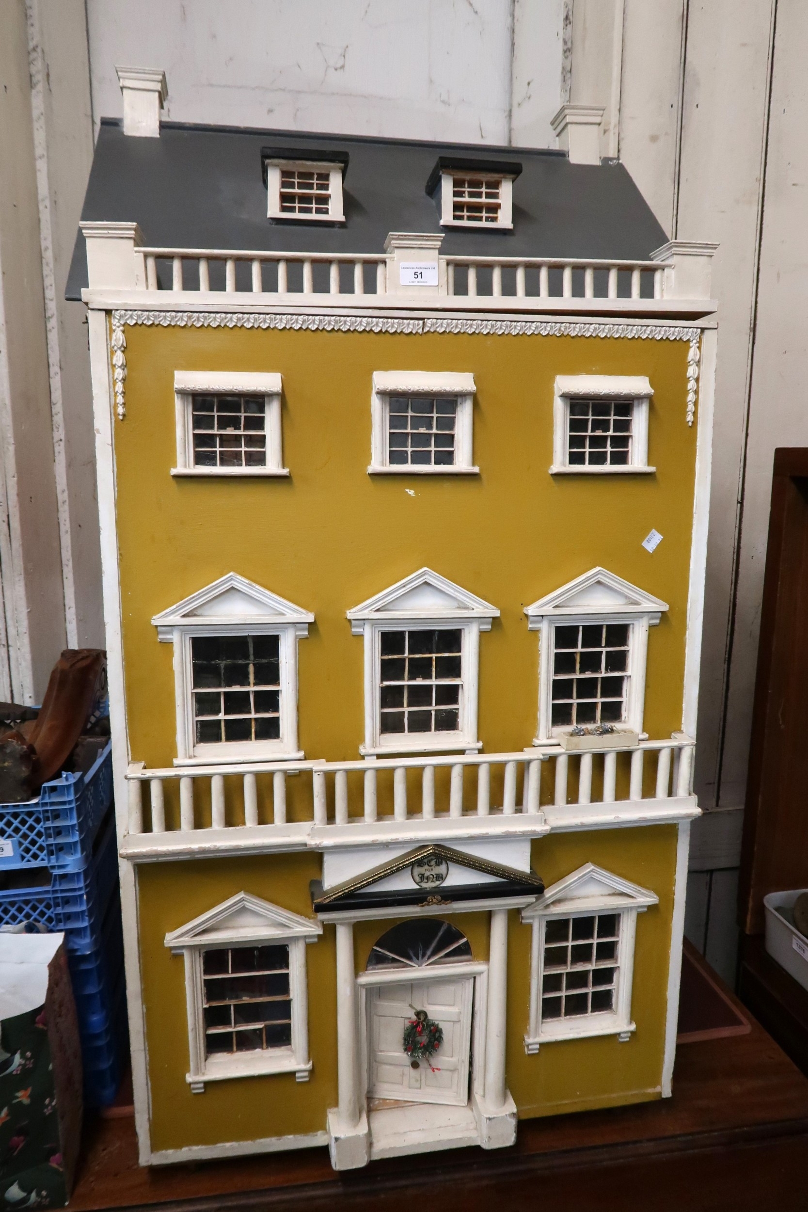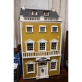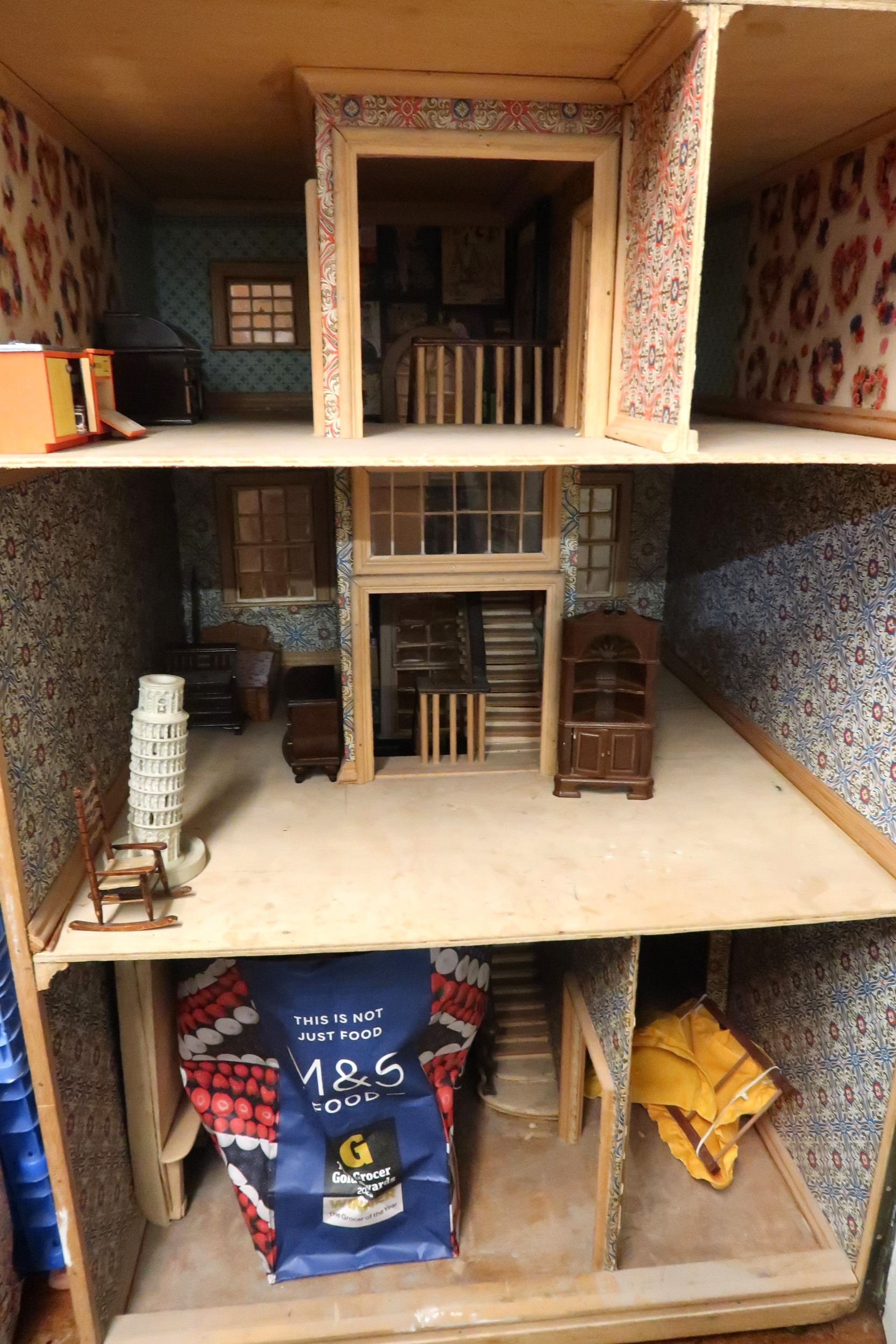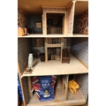 Large vintage handmade doll's house containing a collection of various furniture and furnishings
