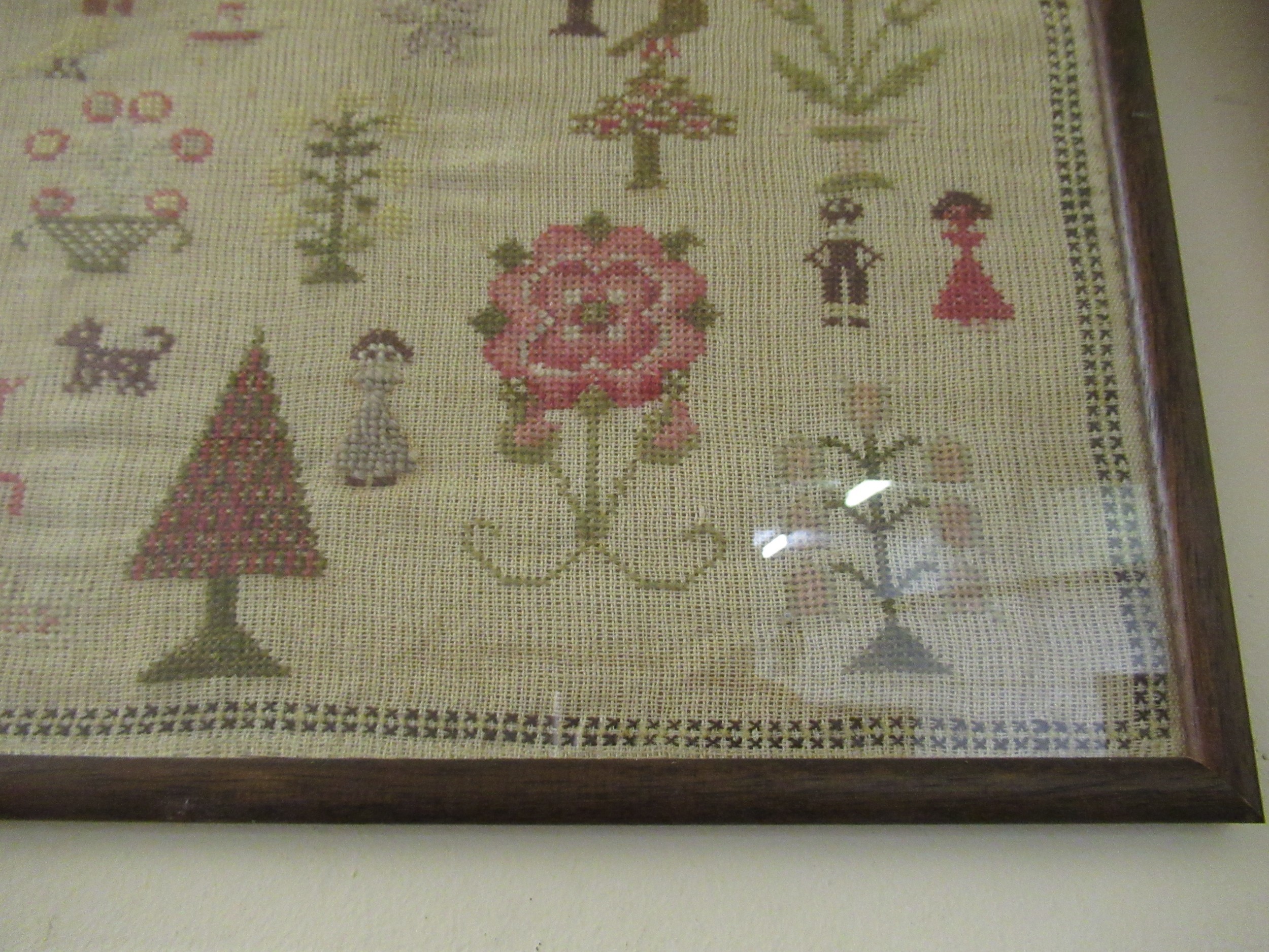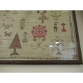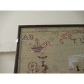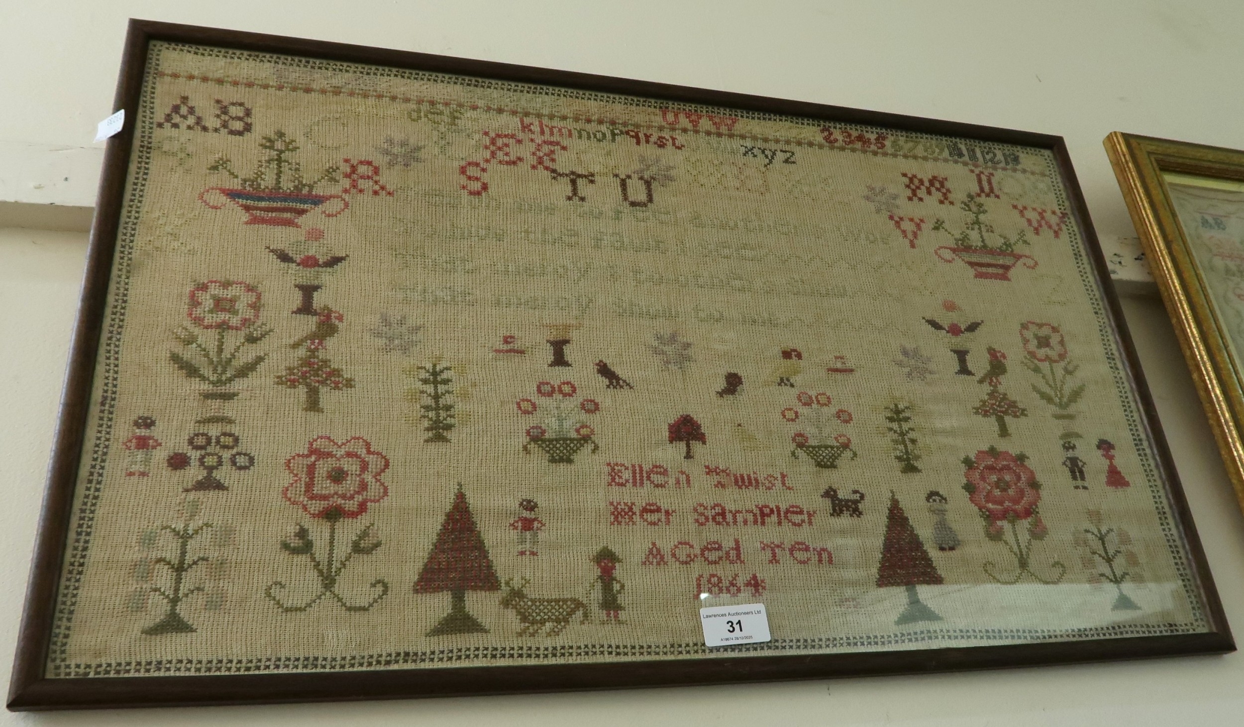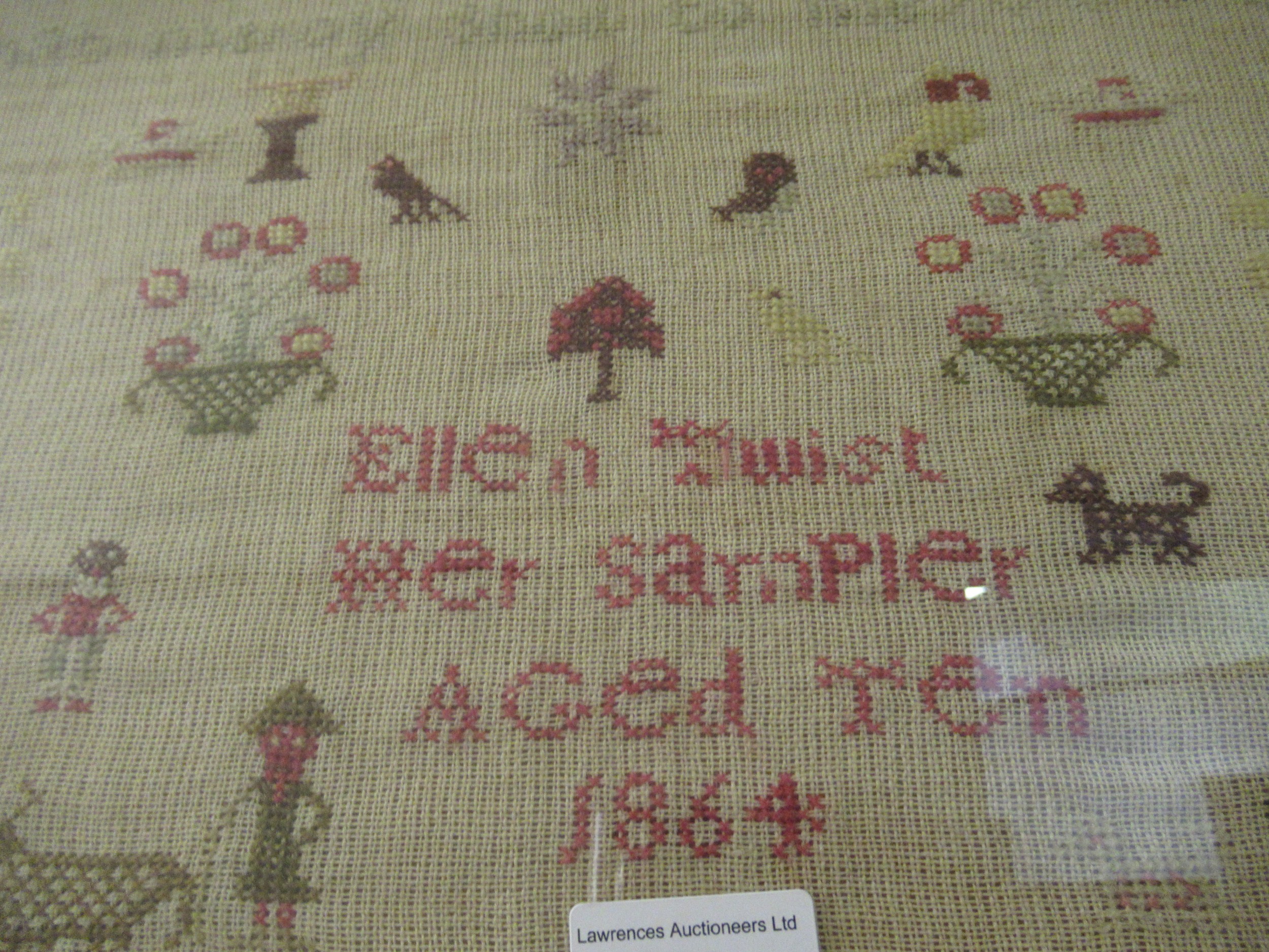 Victorian needlework sampler of pictorial, motto, alphabet and numerical design, signed Ellen Twist, aged 10, 1864, 38 x 64cm, framed