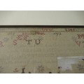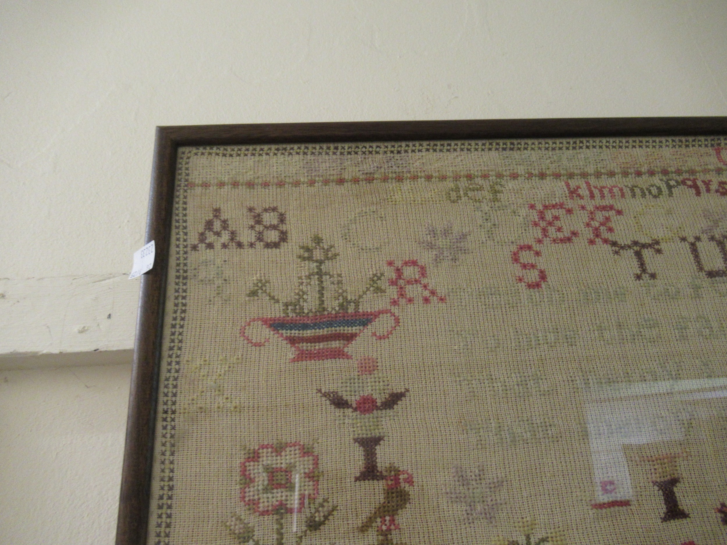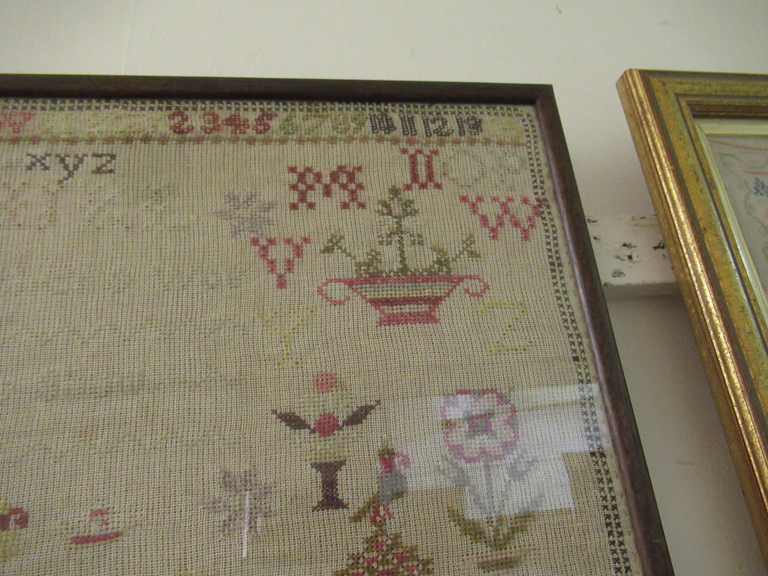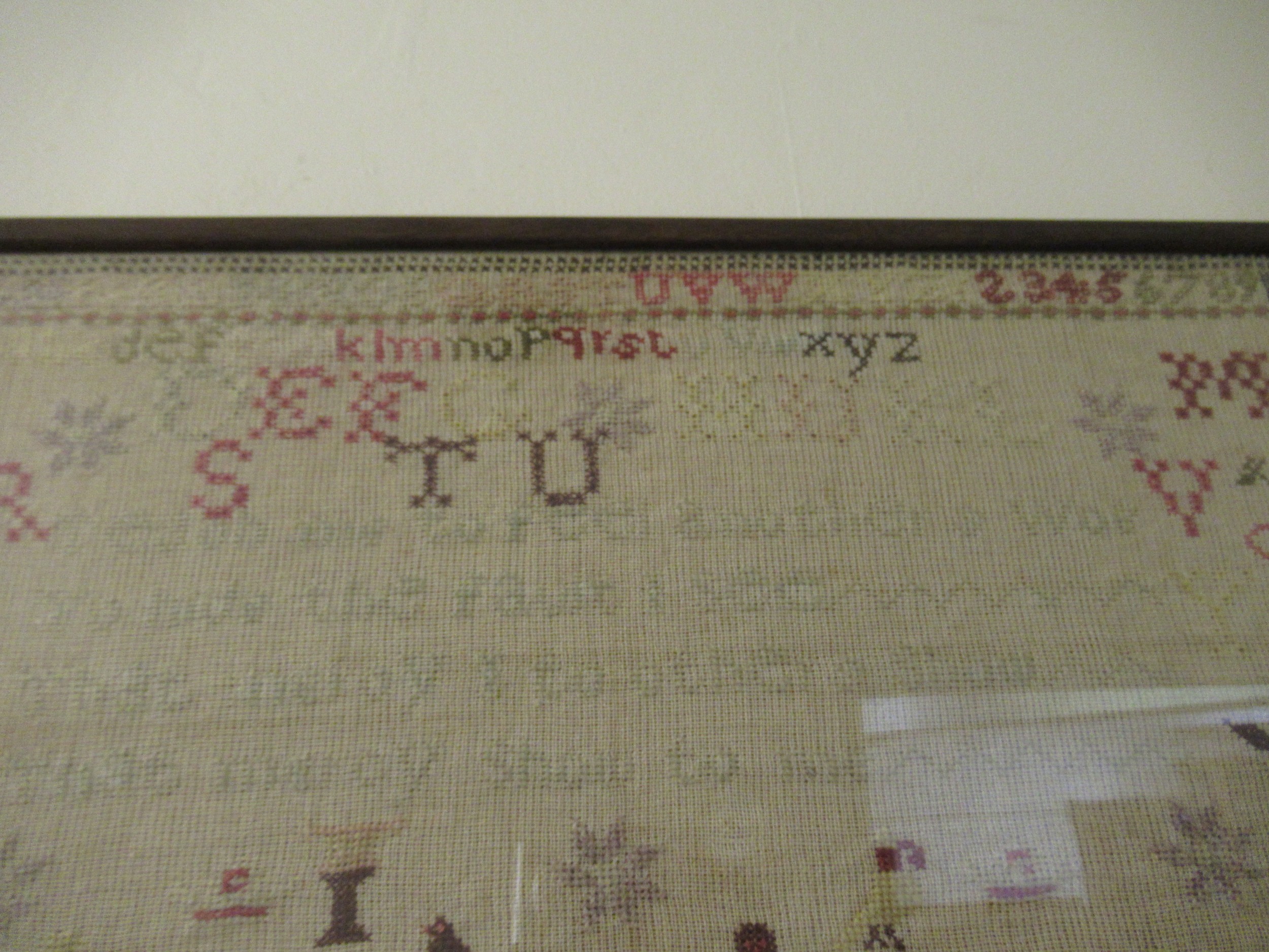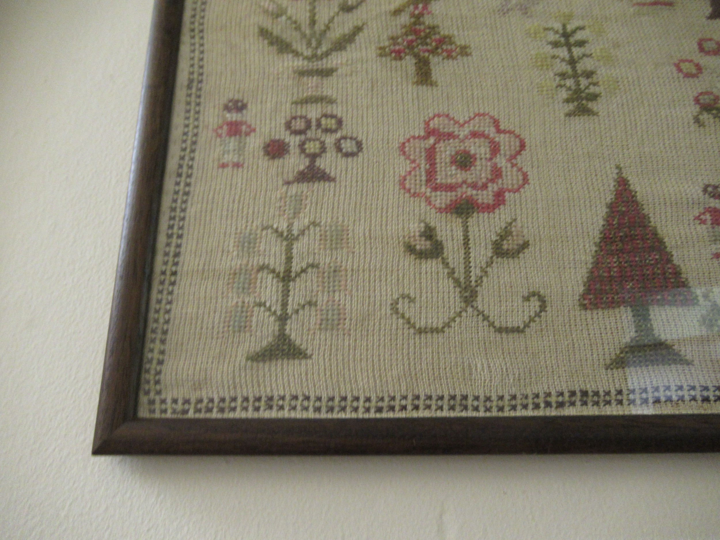 Victorian needlework sampler of pictorial, motto, alphabet and numerical design, signed Ellen Twist, aged 10, 1864, 38 x 64cm, framed