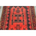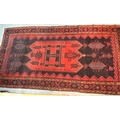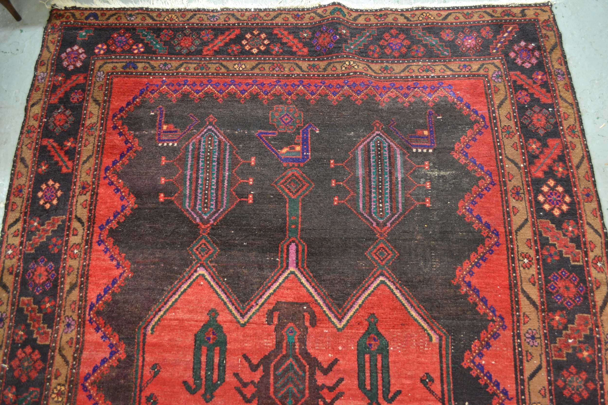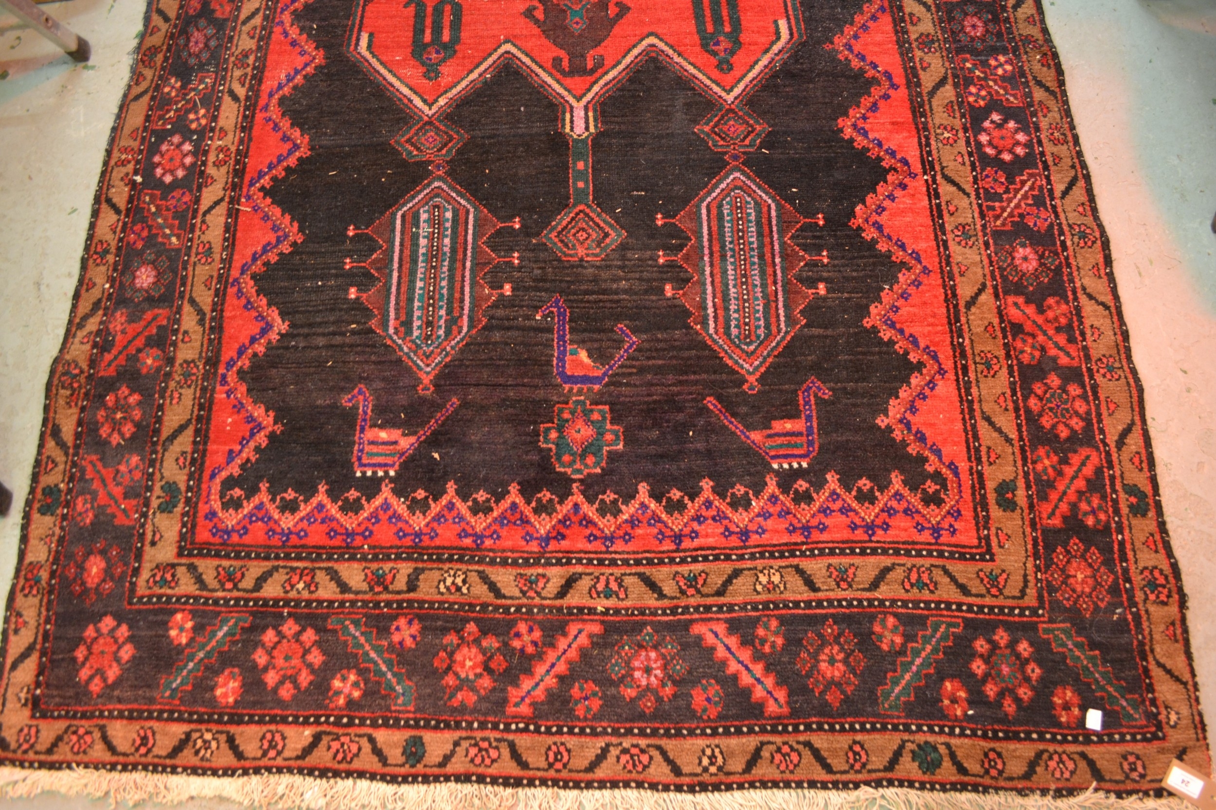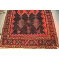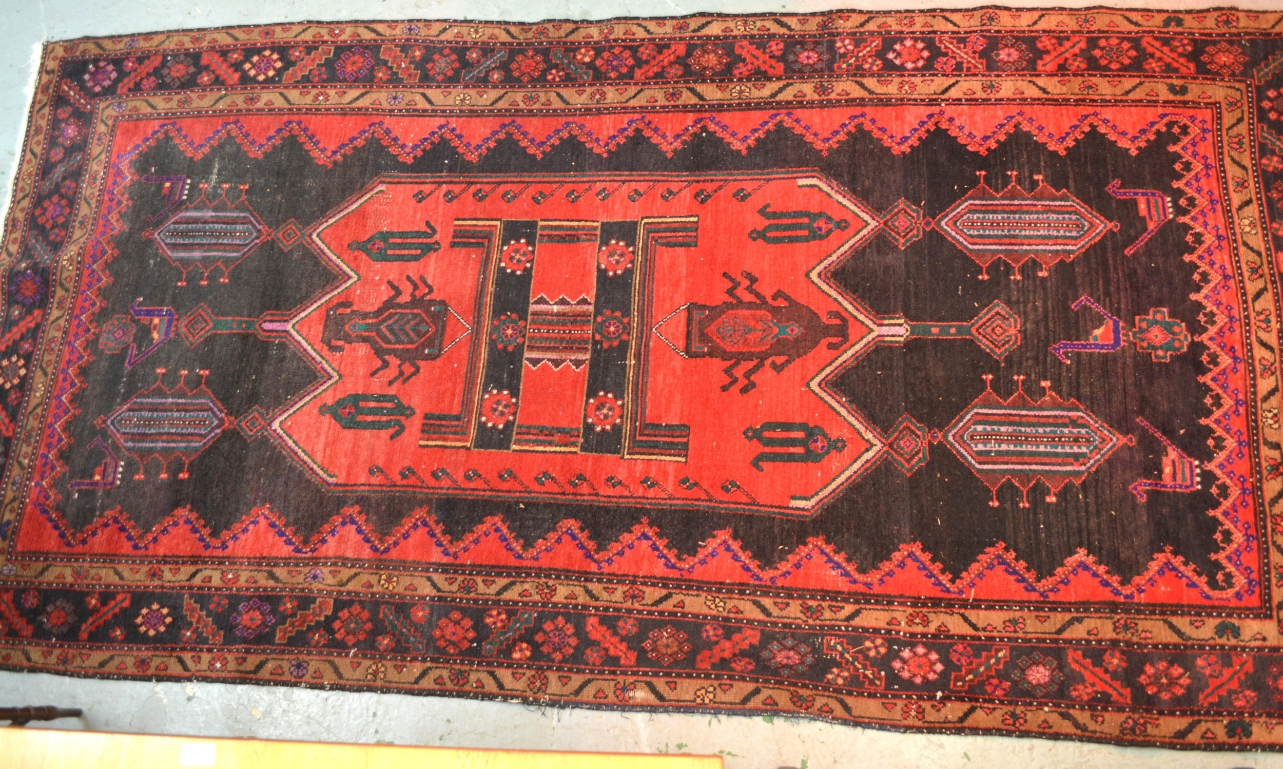Large Kurdish rug with a geometric red ground centre medallion on a dark ground with further stylised motifs within a triple border, 296 x 150cm approximately