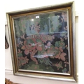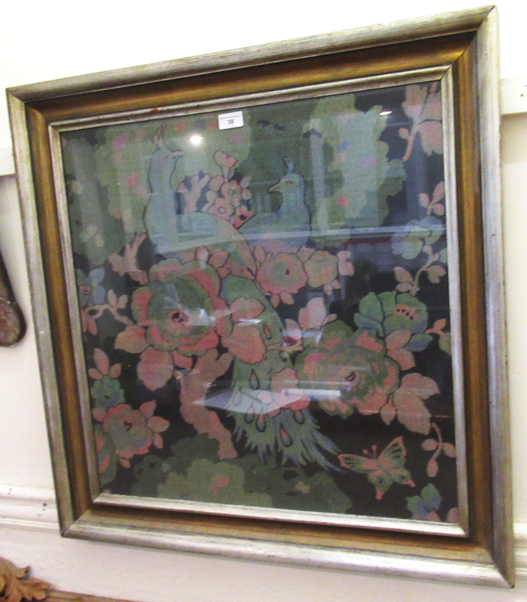 Mid 20th Century machine woven woolwork picture, peacocks and flowers on a black ground, 60cm square, in a silvered frame