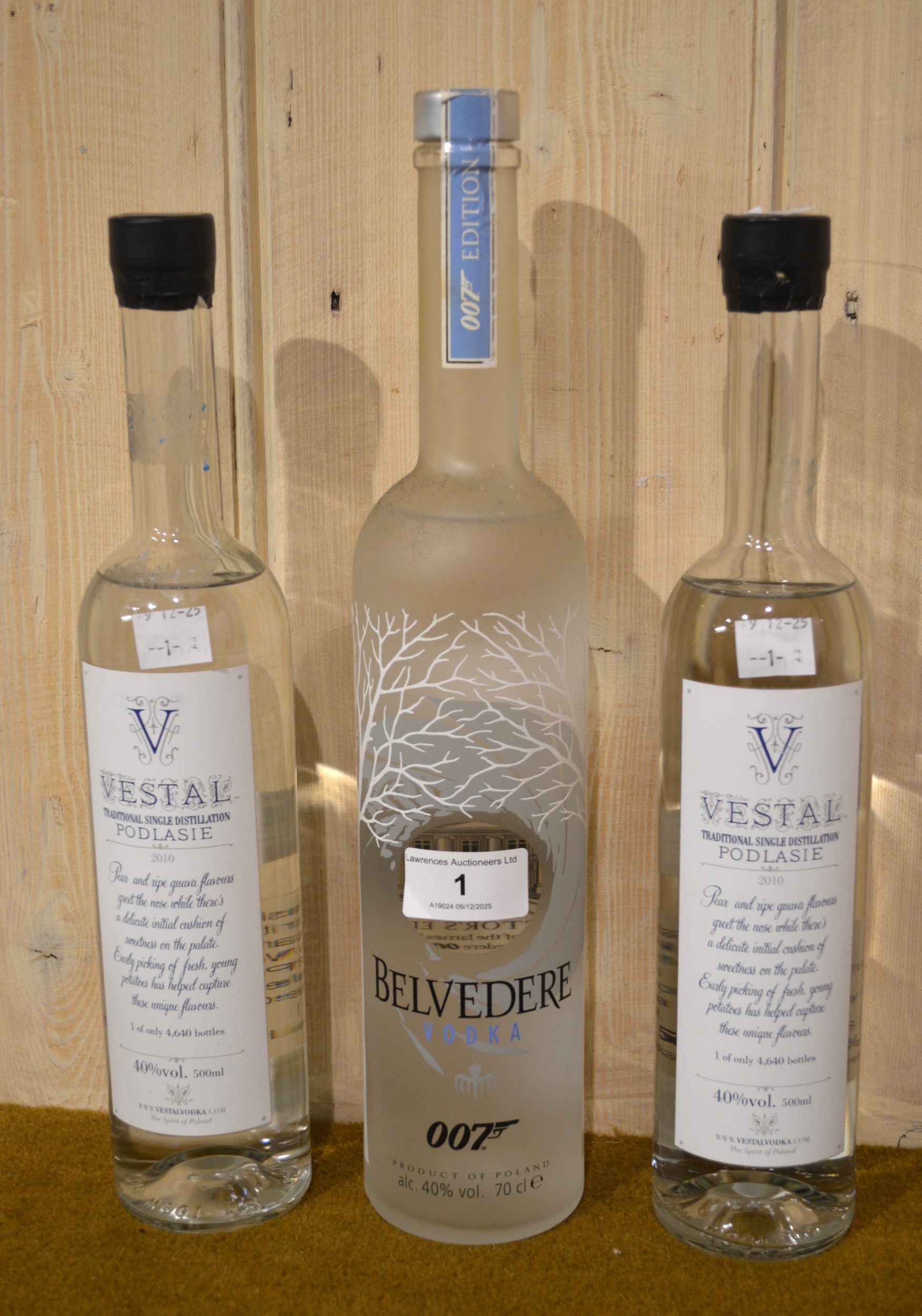 One bottle Belvedere vodka, 007 Edition, together with two bottles Vestal vodka, each from Limited Edition of 4,640