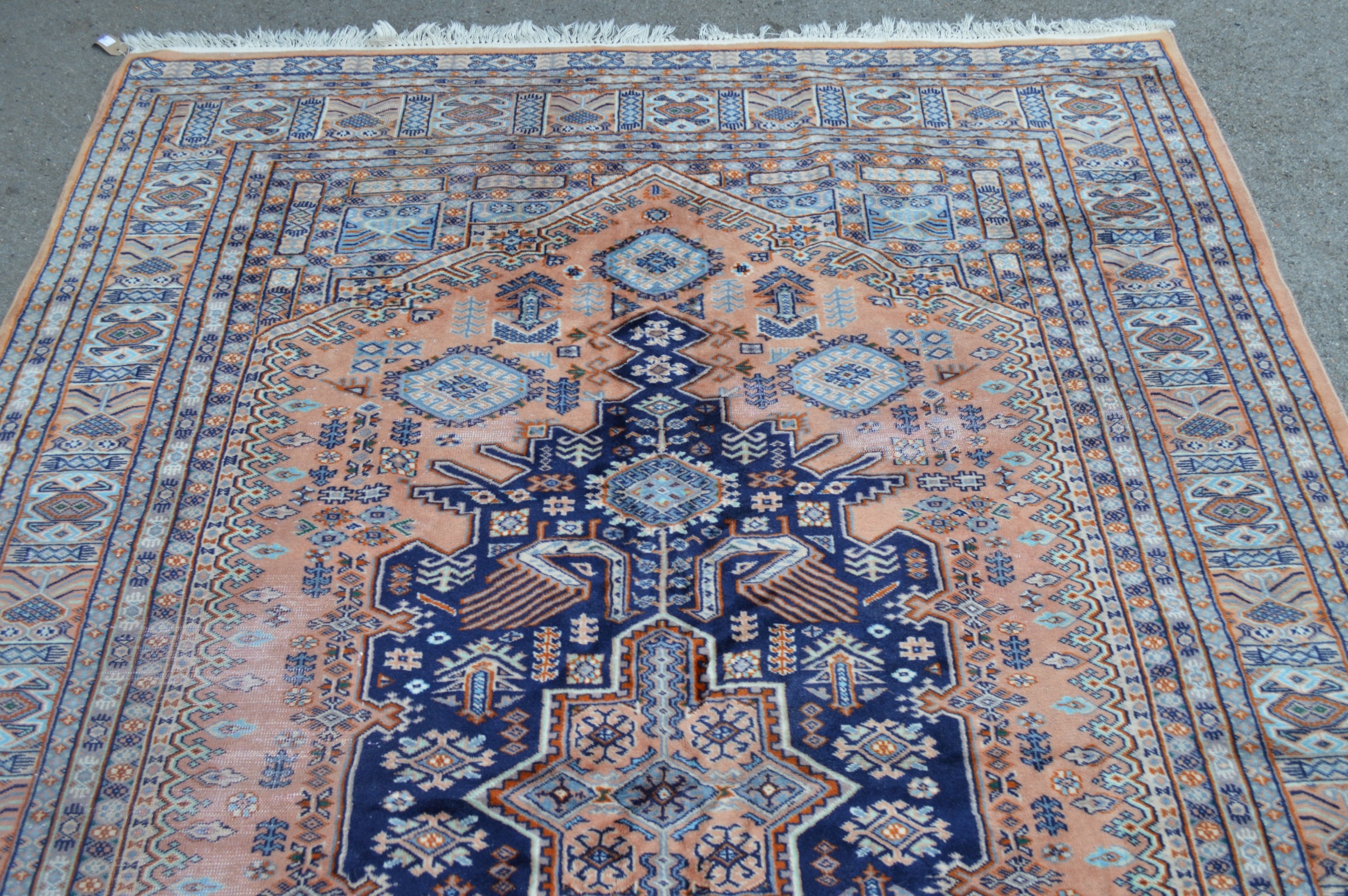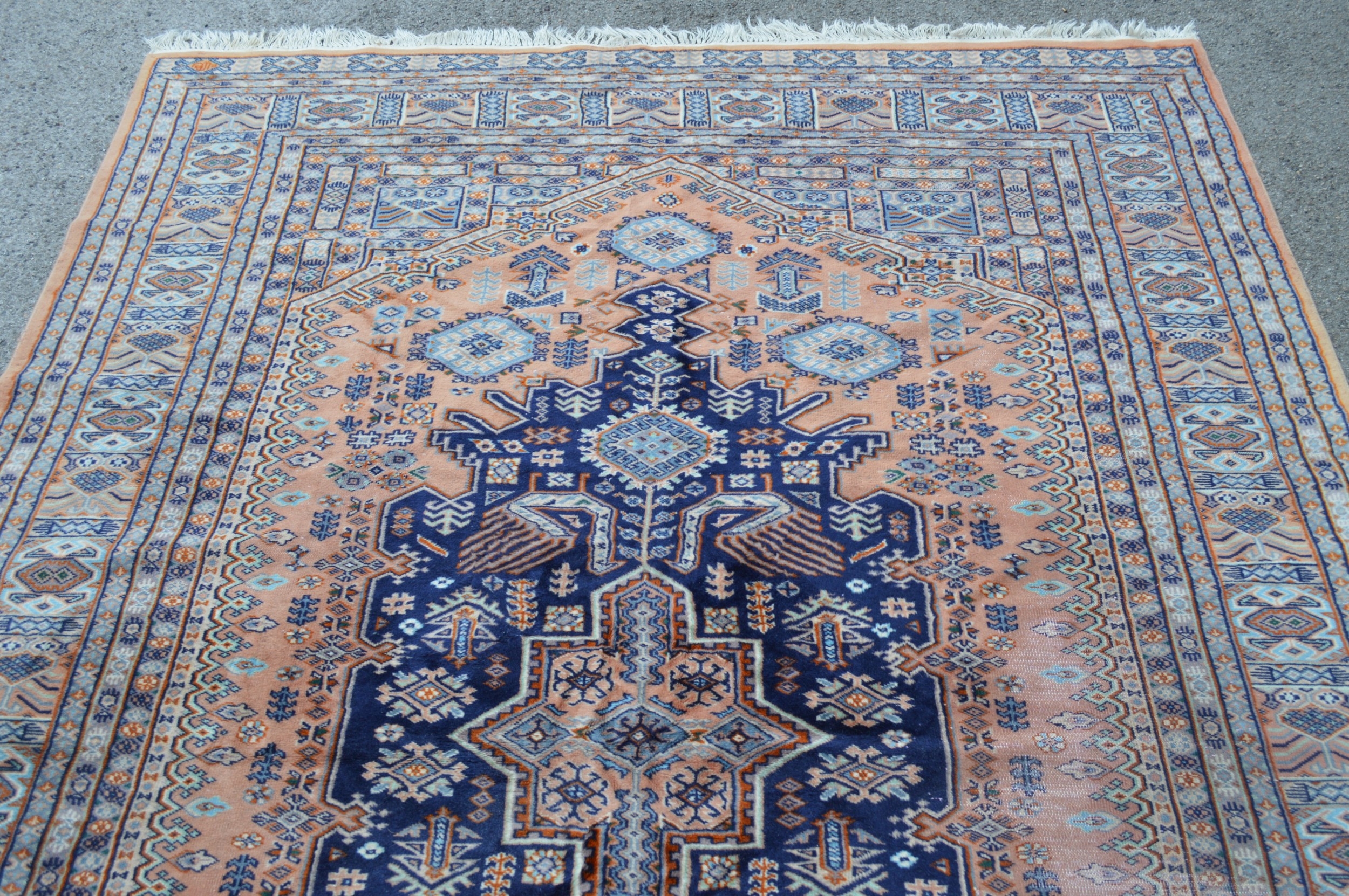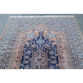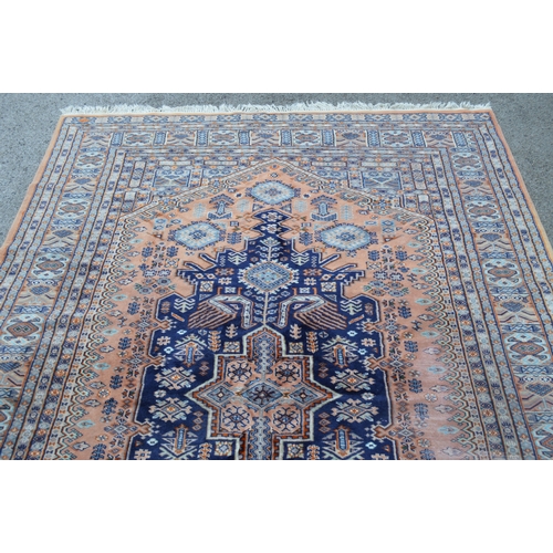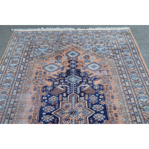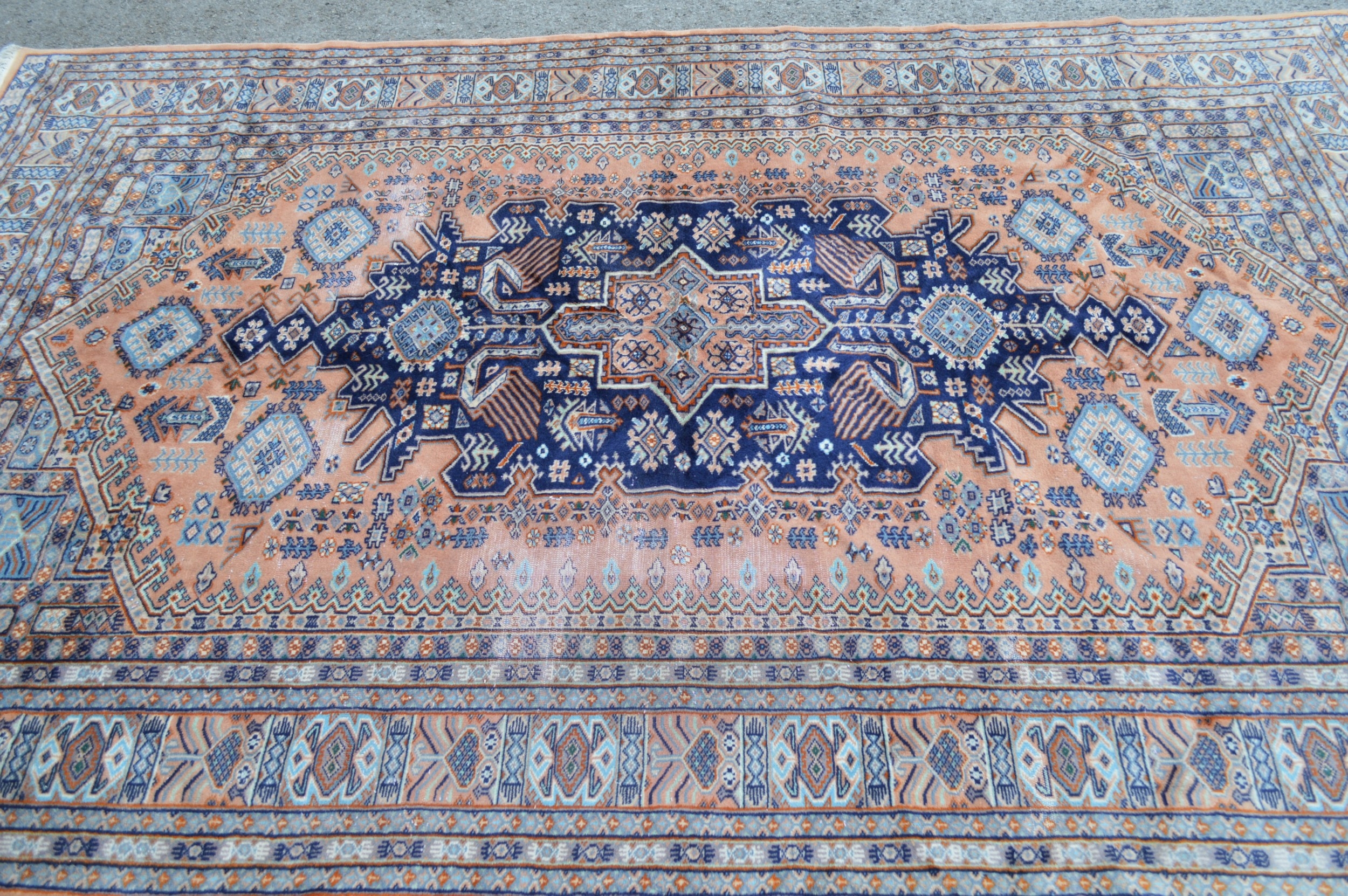 20th Century Indo-Persian rug, the central medallion with multiple borders on a pale orange and dark blue ground, 182 x 285cm