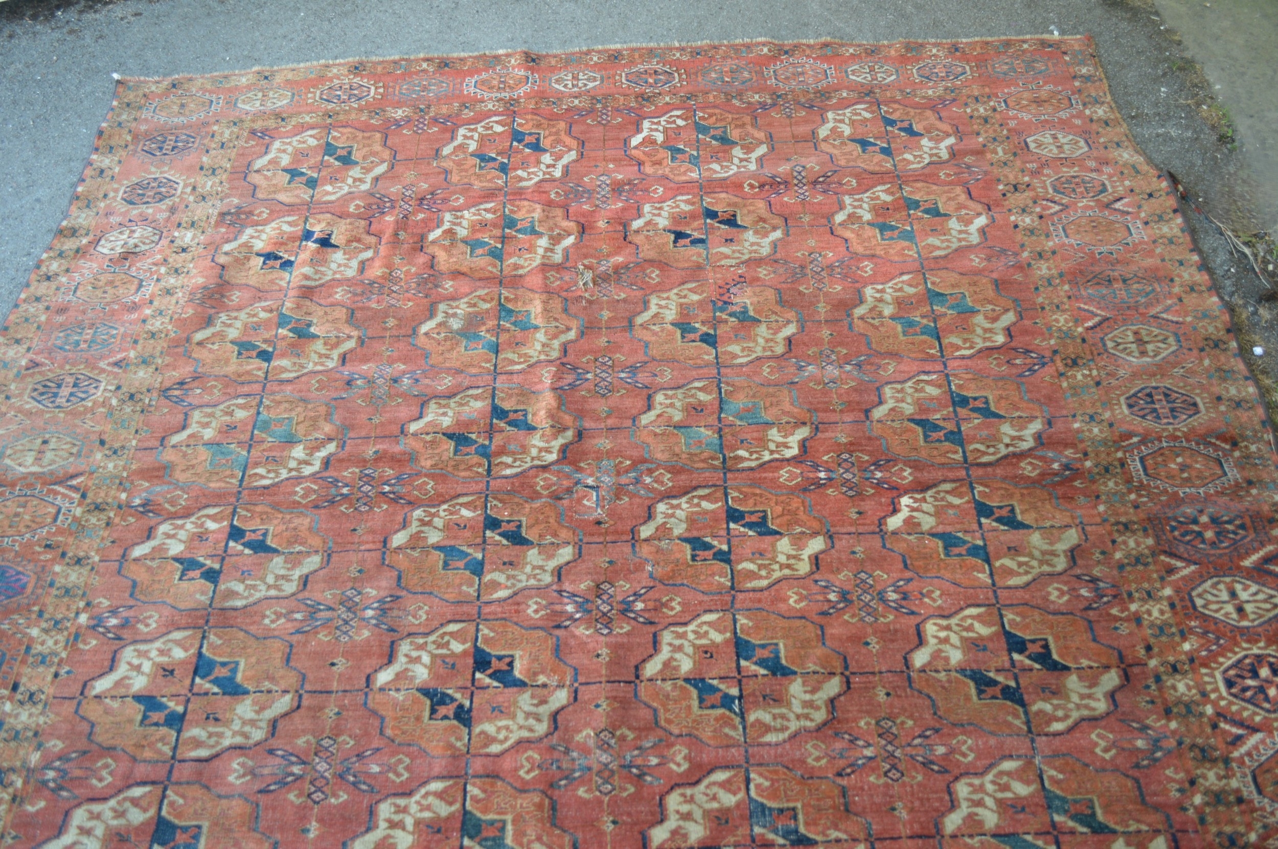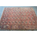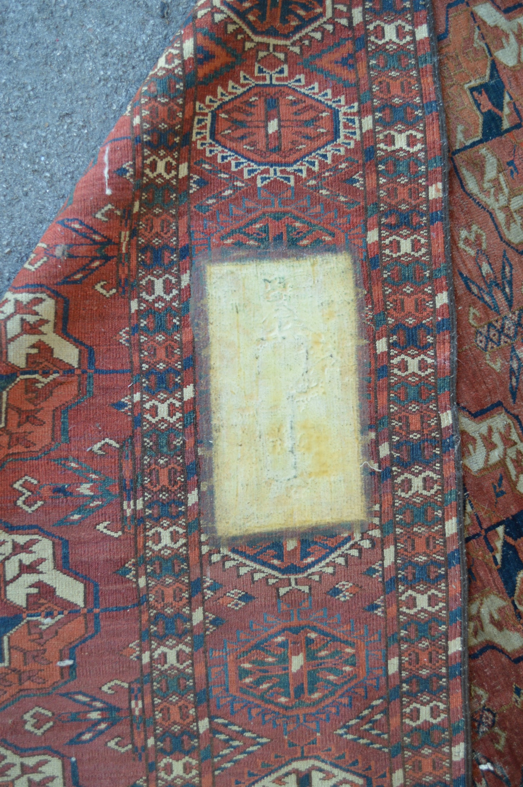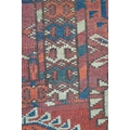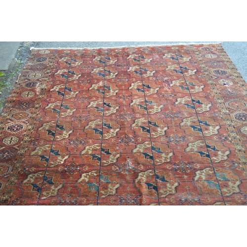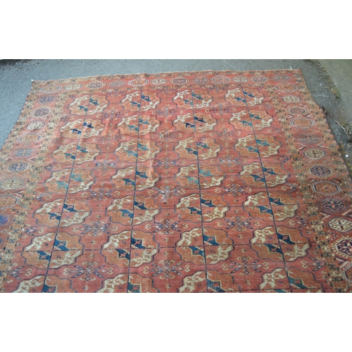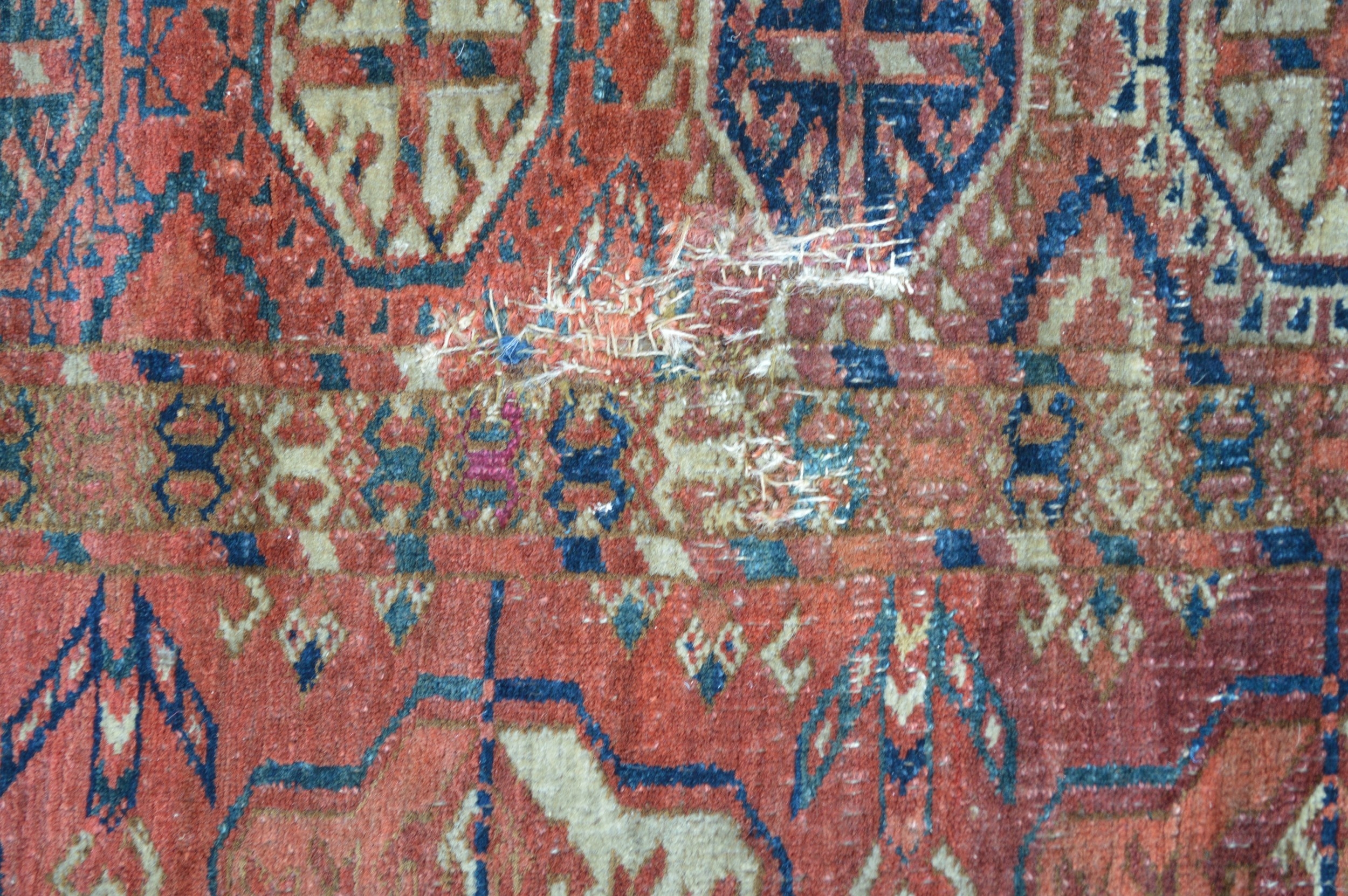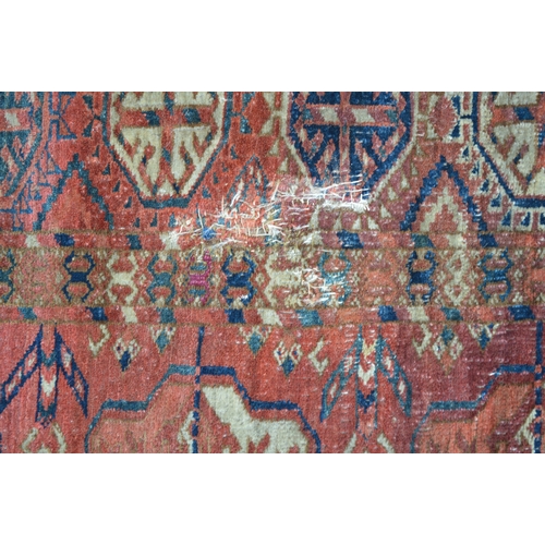 Antique Tekke carpet with four rows of ten gols on a red ground with borders (damages and wear), 245 x 195cm